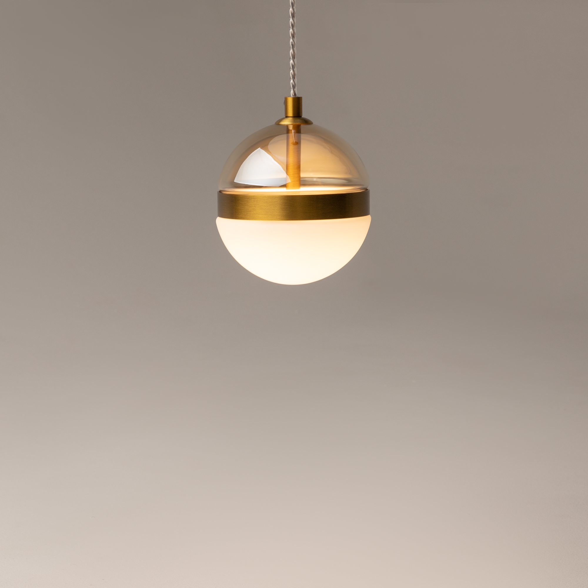 Черная потолочная чаша дополнена финишным антибликовым покрытием sandy, декоративный элемент плафона выполнен из металла цвета сатинированной латуни. Сочетание двух фактурных стекол в плафоне: нижняя полусфера из матового белого стекла для создания мягкого рассеянного света, верхняя часть плафона - из тонированного янтарного стекла. Внутри установлен LED-модуль, создающий равномерное освещение, направленное вверх и вниз. Цветовая температура – 3000К, угол рассеивания — 120°.