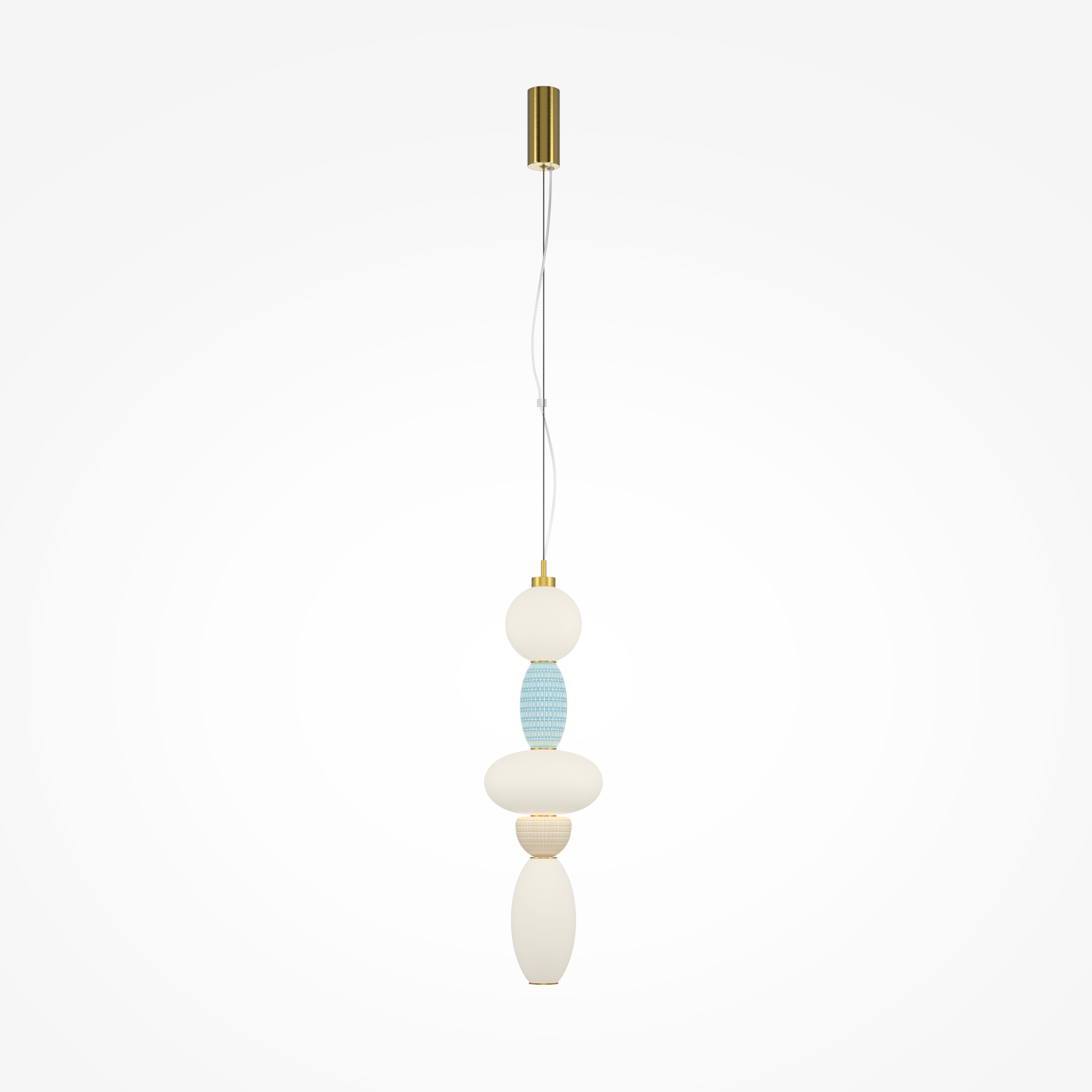 Металлическая арматура цвета латуни. Плафоны из белого стекла для мягкого, равномерного освещения, декоративные элементы из цветной керамики. Угол рассеивания 120°. Цветовая температура – 3000 К. Регулируемый провод длиной 3 м.