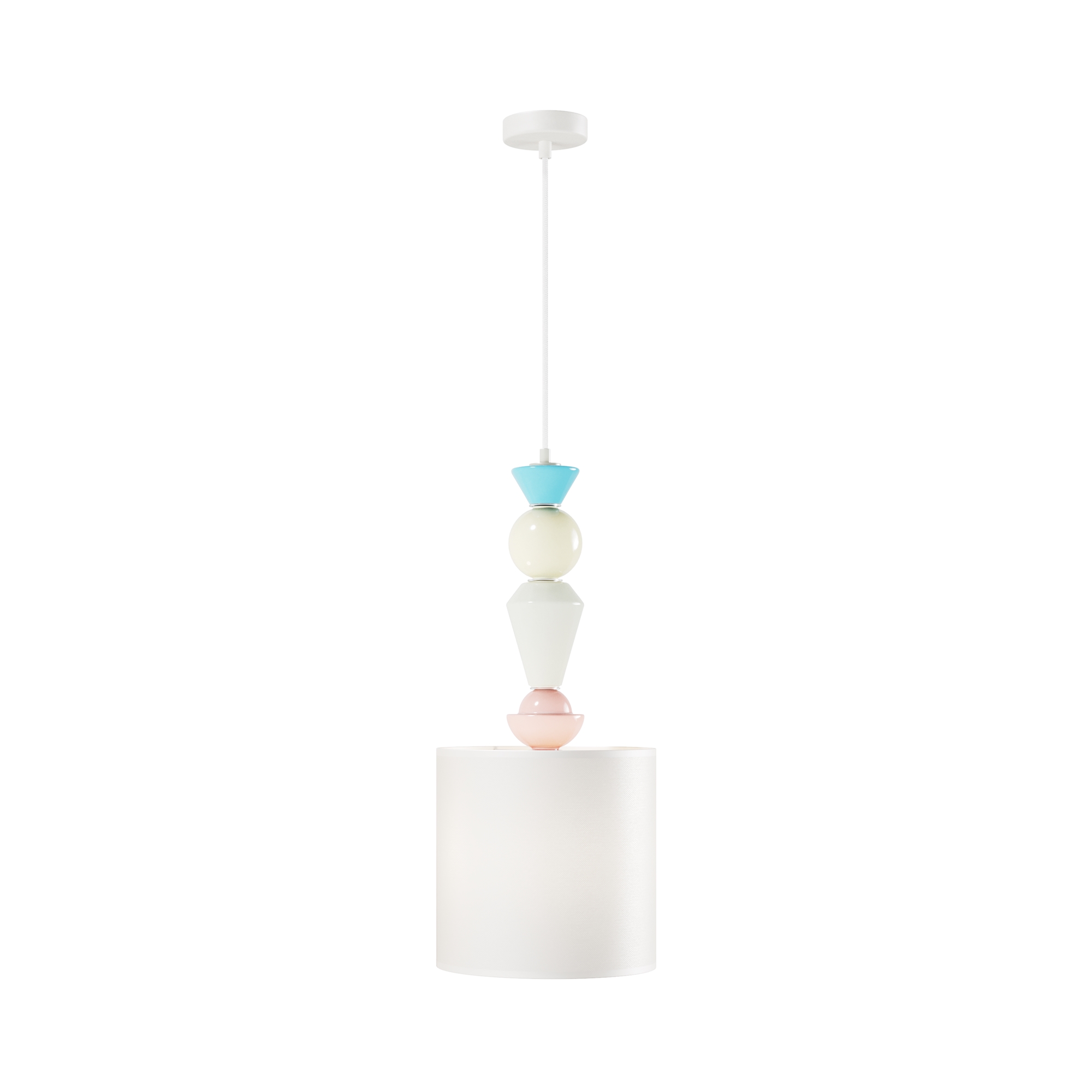Арматура из металла, цвет - белый. Абажур выполнен из натуральной ткани, цветные декоративные элементы в пастельных тонах — из керамики. Белый абажур имеет классическую цилиндрическую форму, ткань дает мягкий рассеянный свет. Светильники комплектуются сменными лампами с цоколем Е27 (не входят в комплект). Провод подвесного светильника можно регулировать по длине. Декор напоминает стилистику крафтового искусства