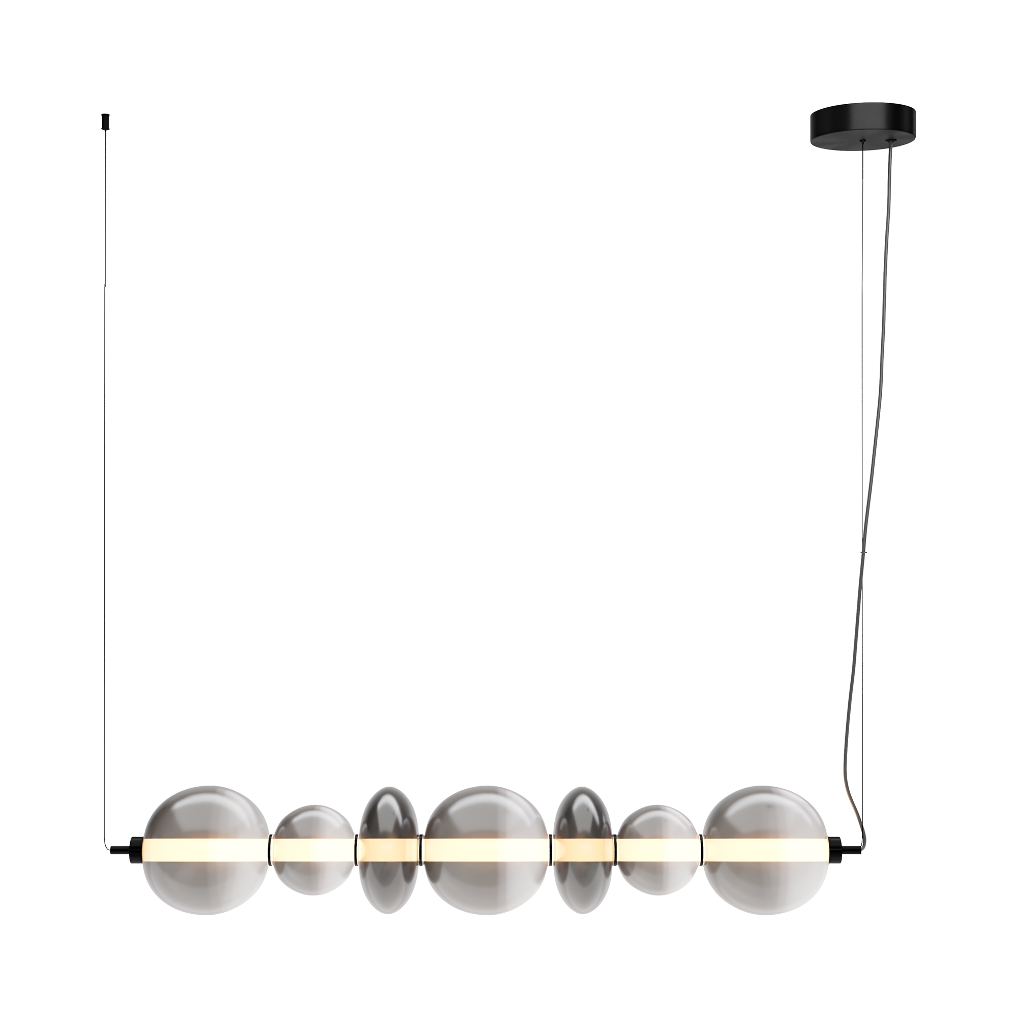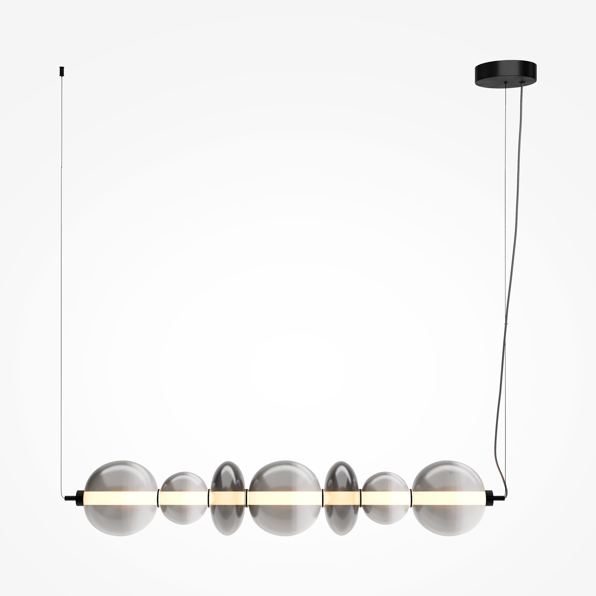 Светильники с тонированными выдувными стеклянными плафонами (дымчатыми или янтарными) и металлической арматурой (черной или цвета латуни). Окрашивание плафонов градиентное. Источник света: LED. Световой элемент установлен внутри акрилового рассеивателя. Цветовая температура источника света – 3000К, угол рассеивания — 120°. Торшеры снабжены Push-кнопкой на проводе.