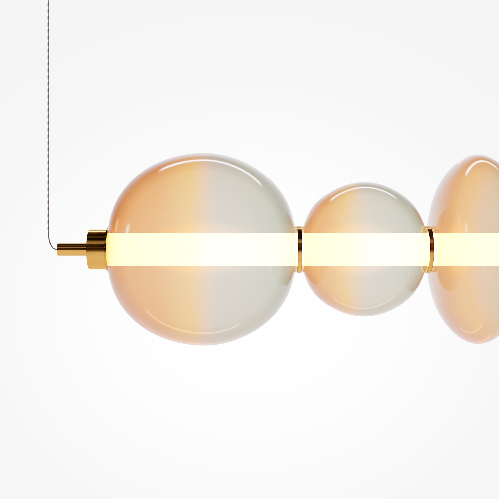 Светильники с тонированными выдувными стеклянными плафонами (дымчатыми или янтарными) и металлической арматурой (черной или цвета латуни). Окрашивание плафонов градиентное. Источник света: LED. Световой элемент установлен внутри акрилового рассеивателя. Цветовая температура источника света – 3000К, угол рассеивания — 120°. Торшеры снабжены Push-кнопкой на проводе.