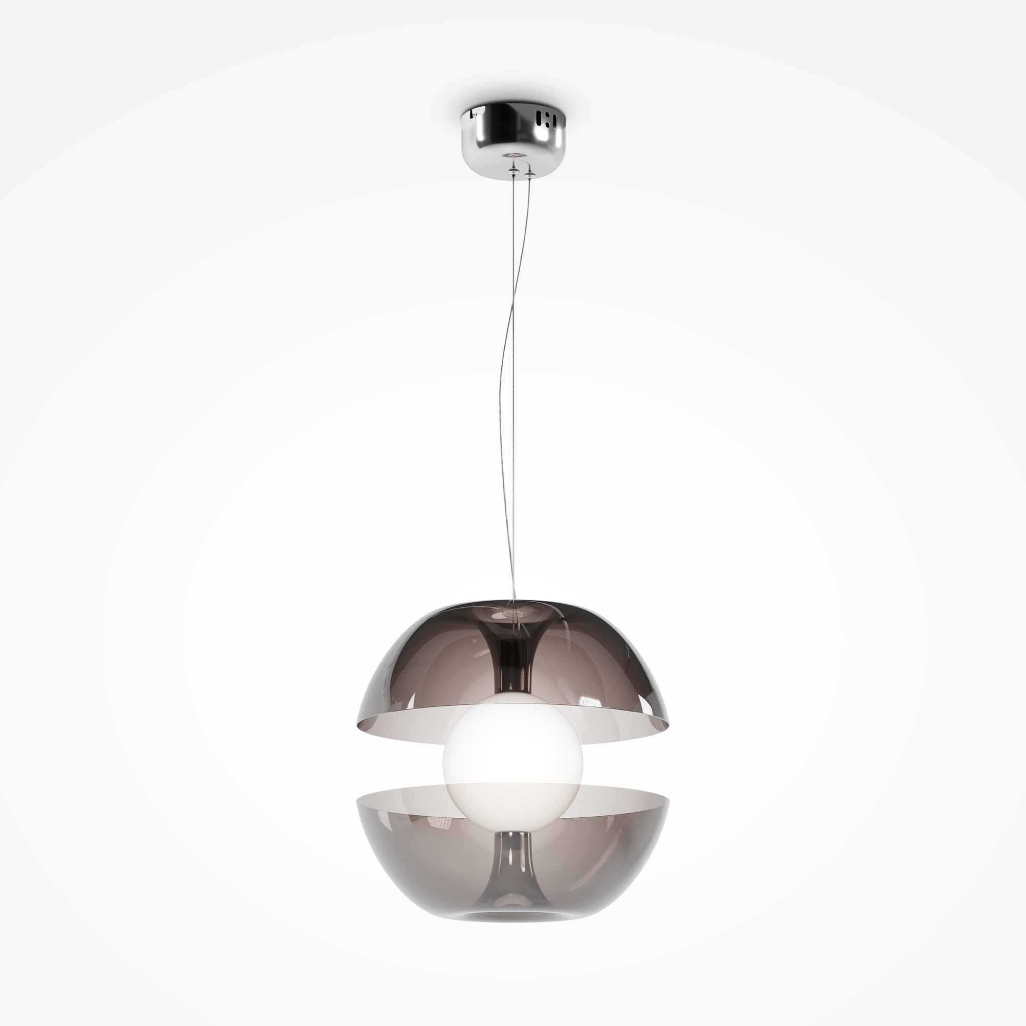 Металлическая арматура в двух оттенках: хром и золото. Плафон из матового стекла. Внешний стеклянный декор в дымчатом и янтарном цвете. Тренд — оптическая иллюзия, эффект парения светового элемента. LED-источник света. Цветовая температура 3000К.