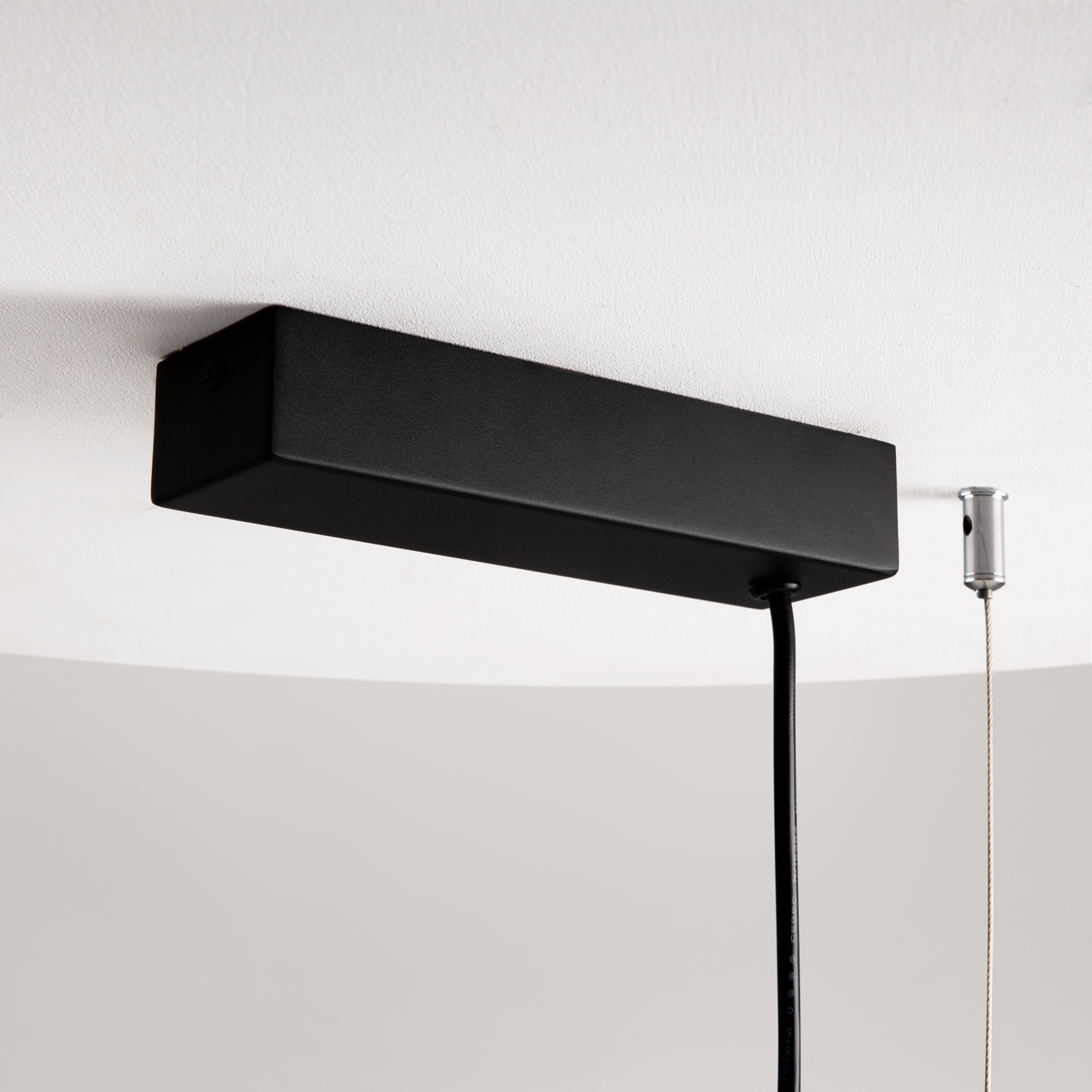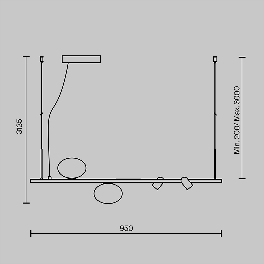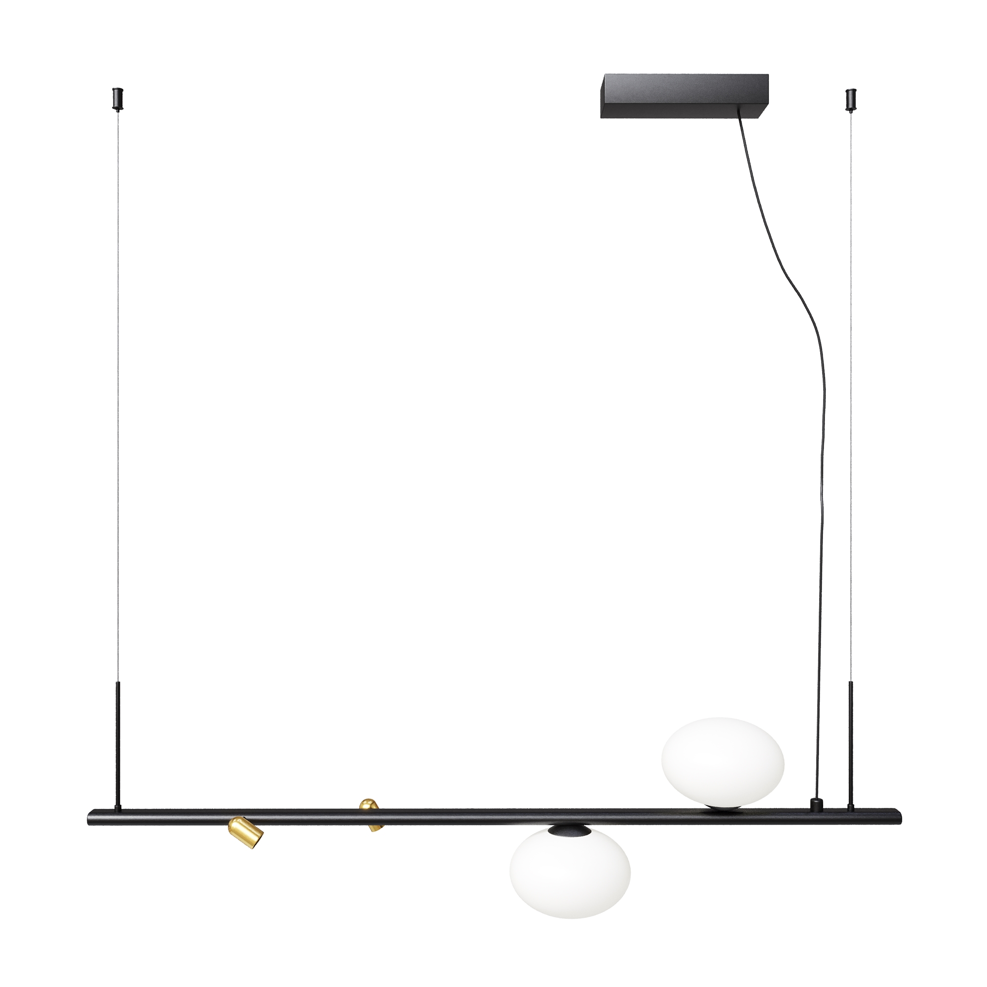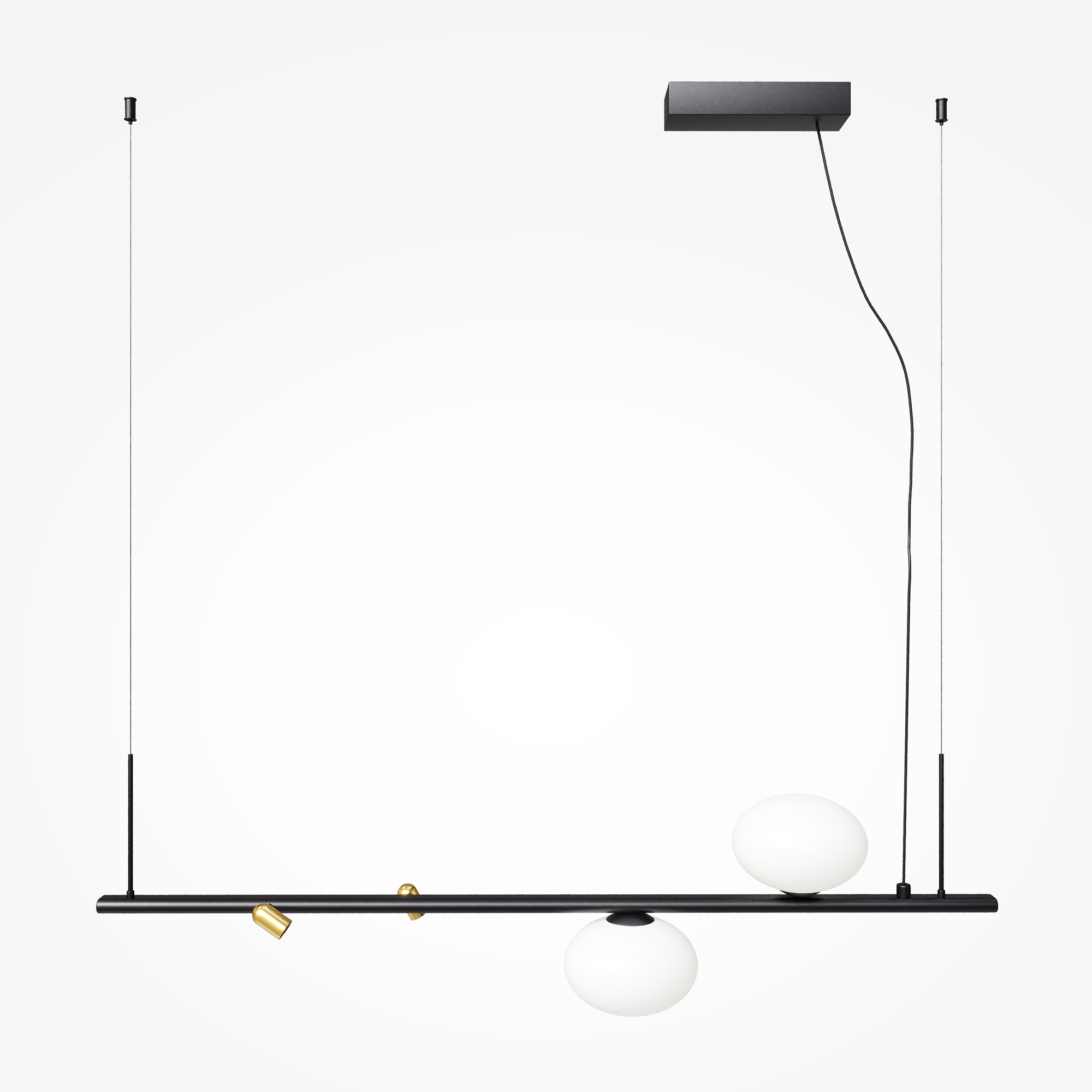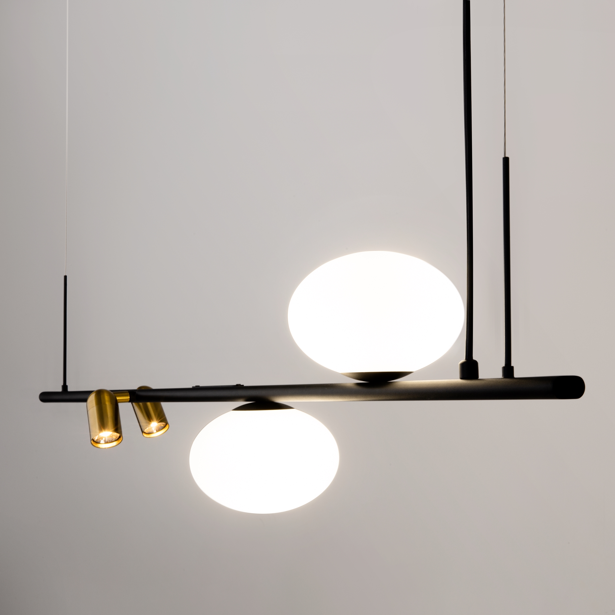 Арматура черного цвета дополнена латунными элементами, стеклянные плафоны — белые матовые. Спот для направленной подсветки снабжен LED-источником света, в плафон устанавливается встроенная лампа с цоколем G9. Цветовая температура — 3000 К, смешанный тип рассеивания. Провод длиной 3 метра можно регулировать по длине. На корпусе бра предусмотрены отдельные кнопки для управления источниками света.