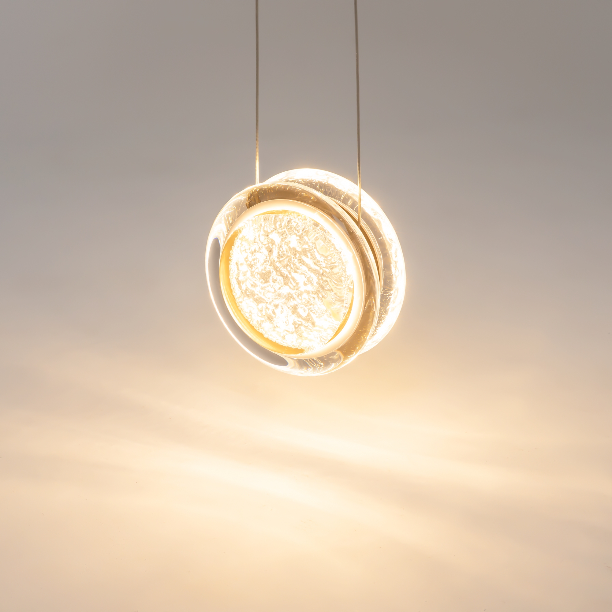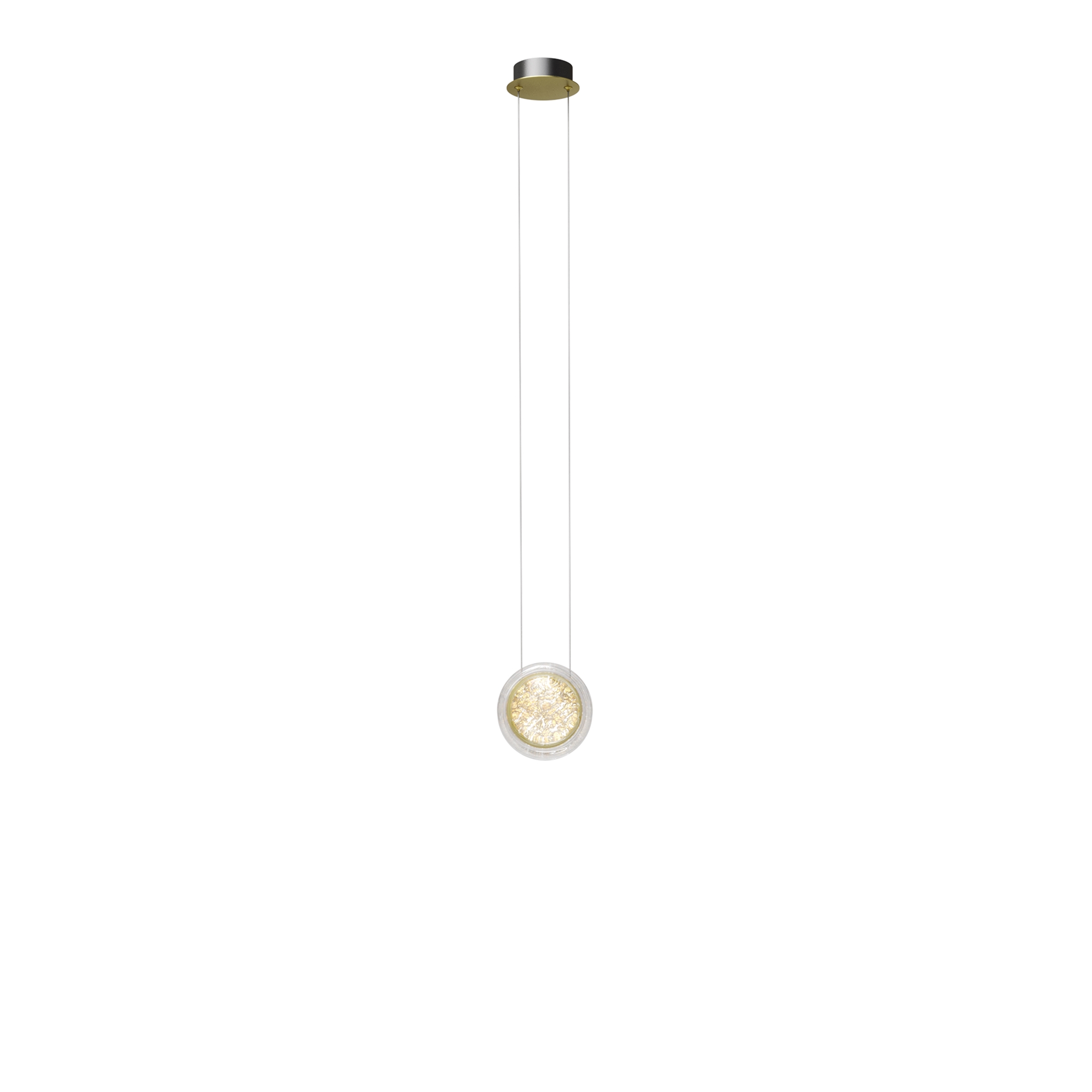 Арматура из металла цвета латунь с сатинированным финишным покрытием сочетается с прозрачными плафонами. Подвесные одинарные, горизонтальный и каскадные светильники оснащаются LED-модулем с двумя плоскими плафонами из акрила со сложным, актуальным паттерном на поверхности. Цветовая температура — 3000К, угол рассеивания — 125 градусов.