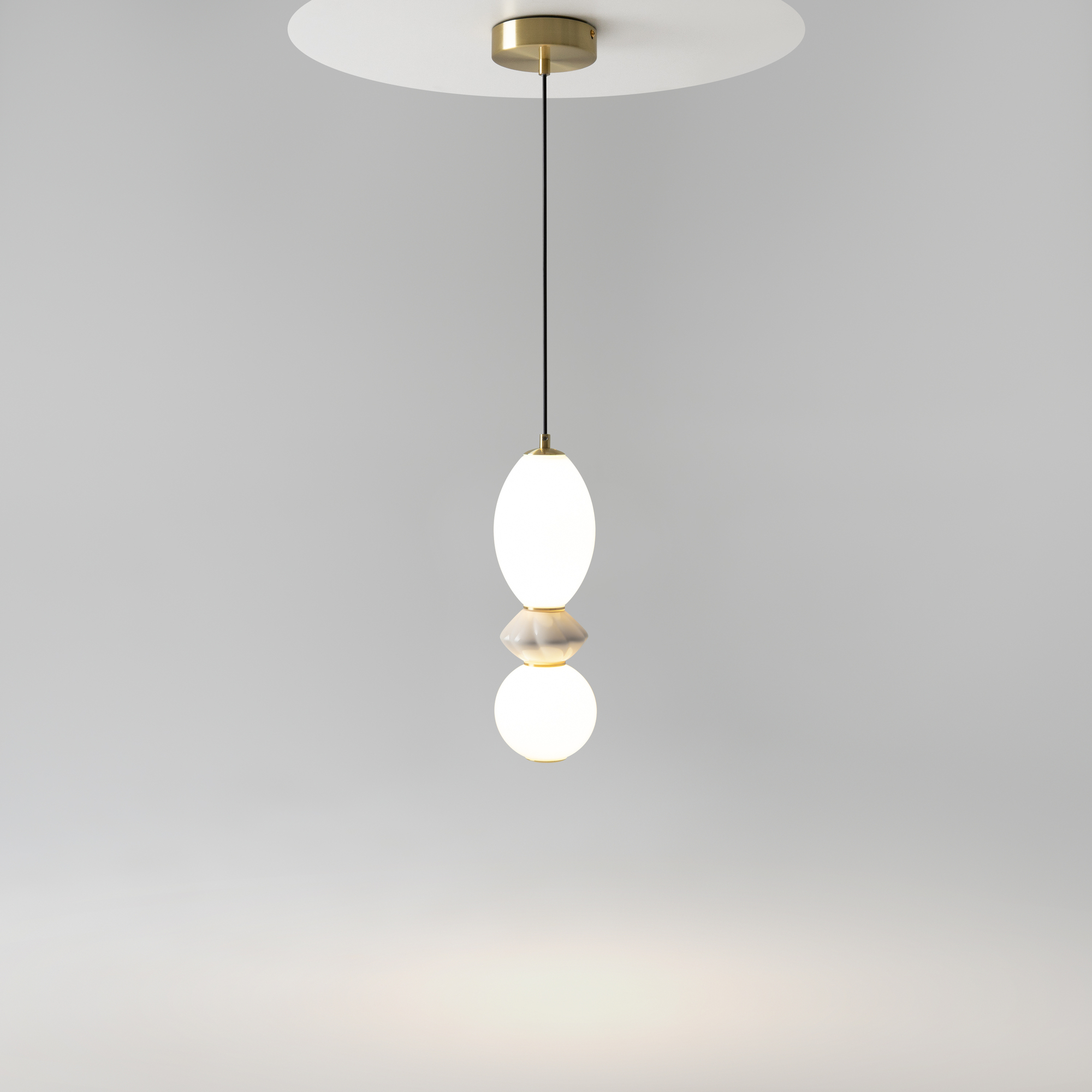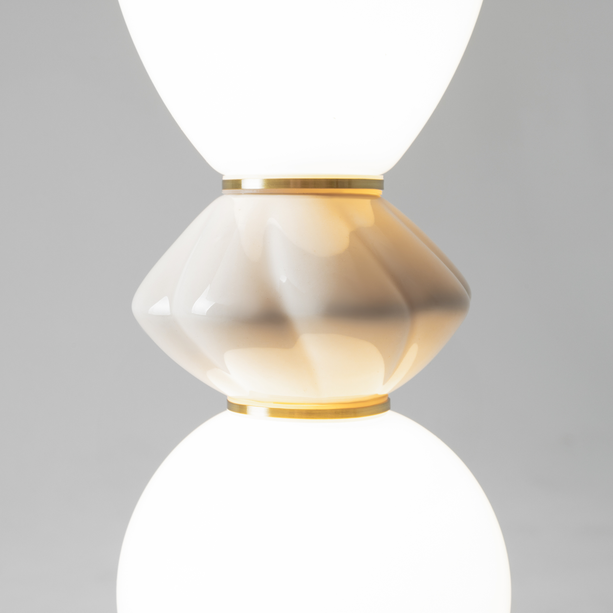 Светильники Brosche подобно броши завершают образ интерьера. В серии представлены подвесные светильники, бра и настольная лампа. Декоративная керамическая бусина покрыта глазурью: кремово-белая (RAL 9001) или серебристо-серая (RAL 7001). Металлическая арматура цвета сатинированной латуни; белые плафоны из глянцевого стекла. Мягкое рассеивание света (3000K) от встроенного LED-источника привносит уют. Светильники Brosche подходят для зонирования пространства в спальнях, гостиных и столовых.