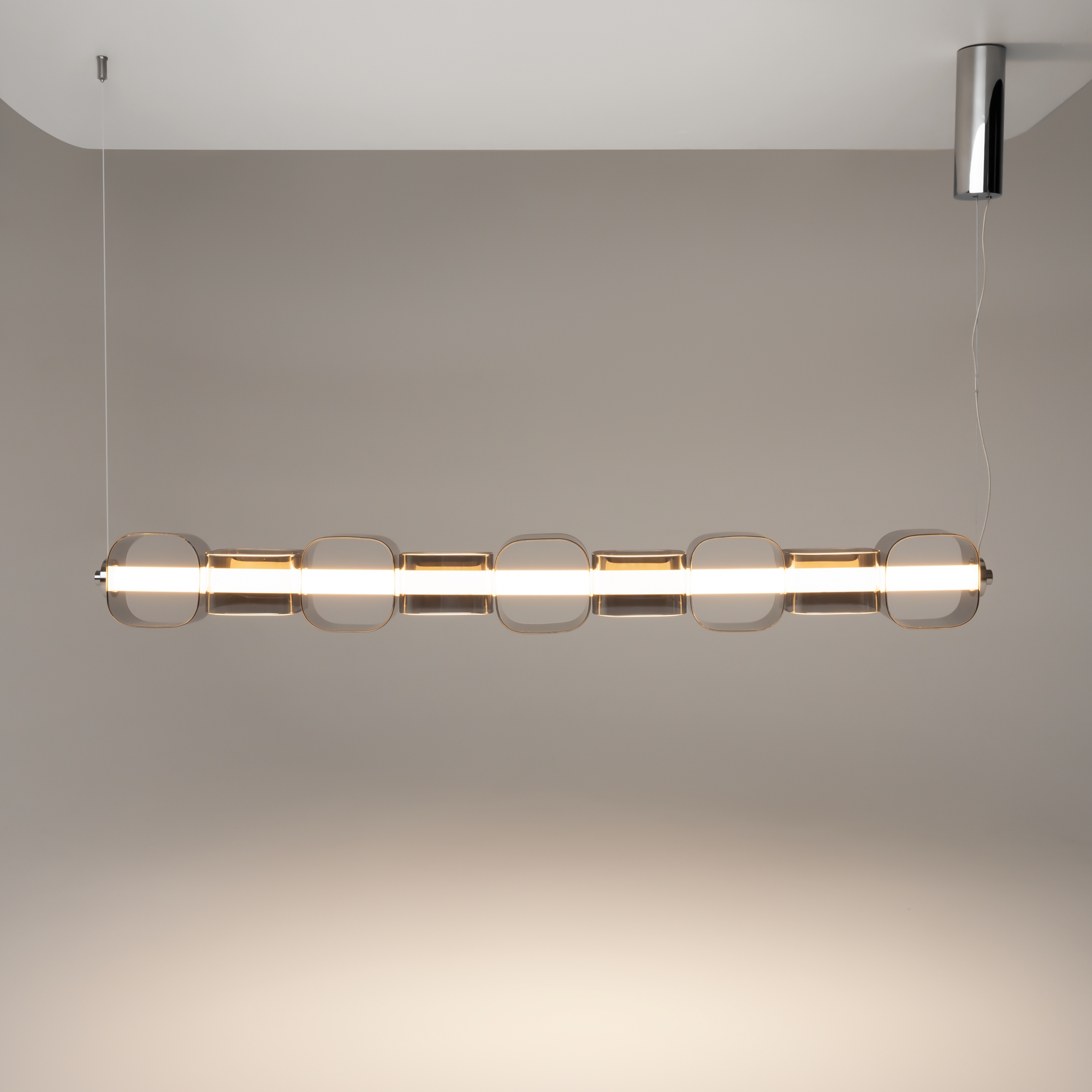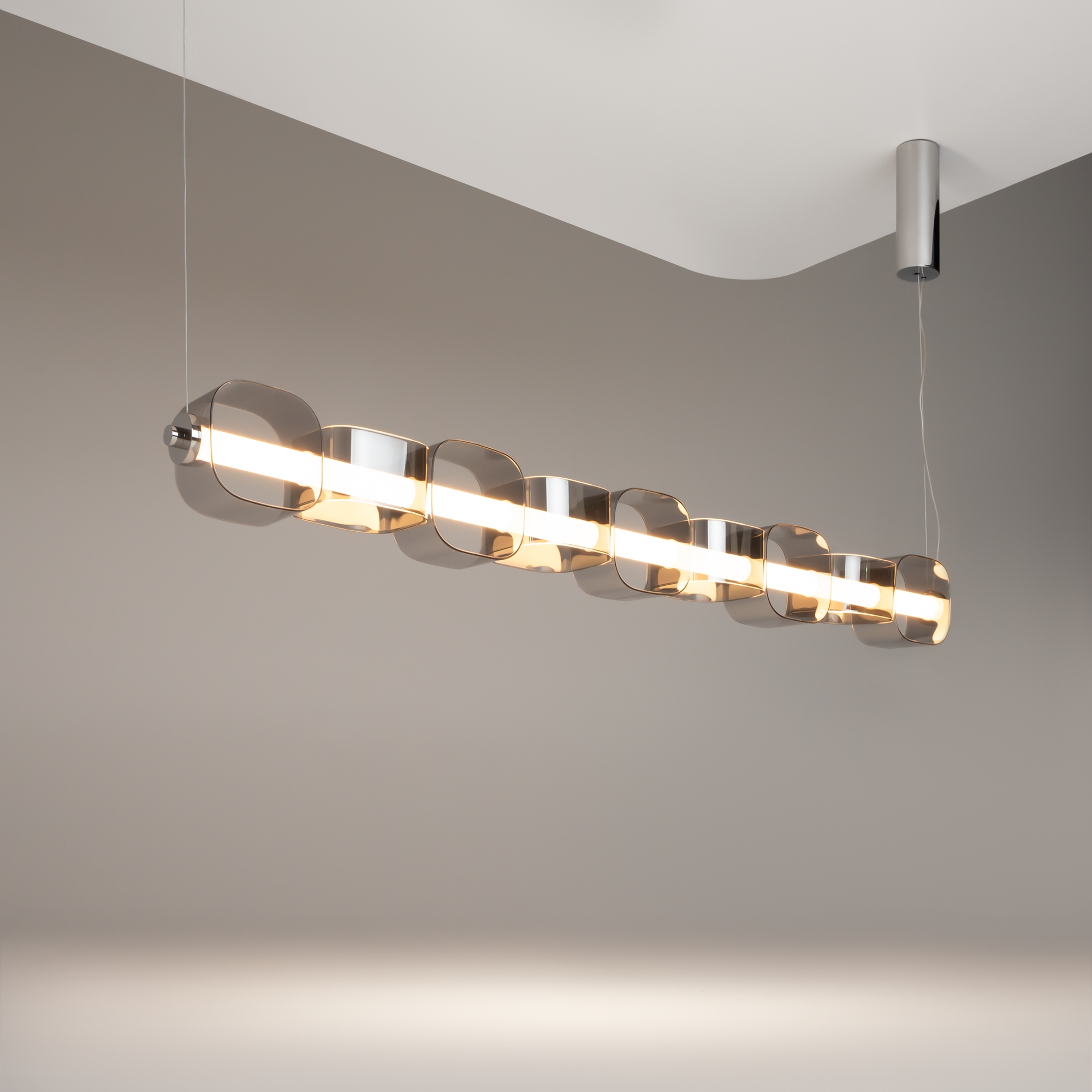 Дизайнерская серия, созданная в коллаборации с Британской Высшей школой Дизайна. Вдохновлена концепцией ритма Леонардо да Винчи. Два цветовых решения: янтарное стекло в сочетание с арматурой в черном цвете с сэнди-эффектом, серое тонированное стекло в сочетании с арматурой с глянцевым хромированным покрытием. LED-источник света скрытый матовым акриловым рассеивателем. Два типа подвесных светильников: одиночный и горизонтальный. Регулируемая высота подвеса и провод длиной 3 метра. Возможность создания композиций.