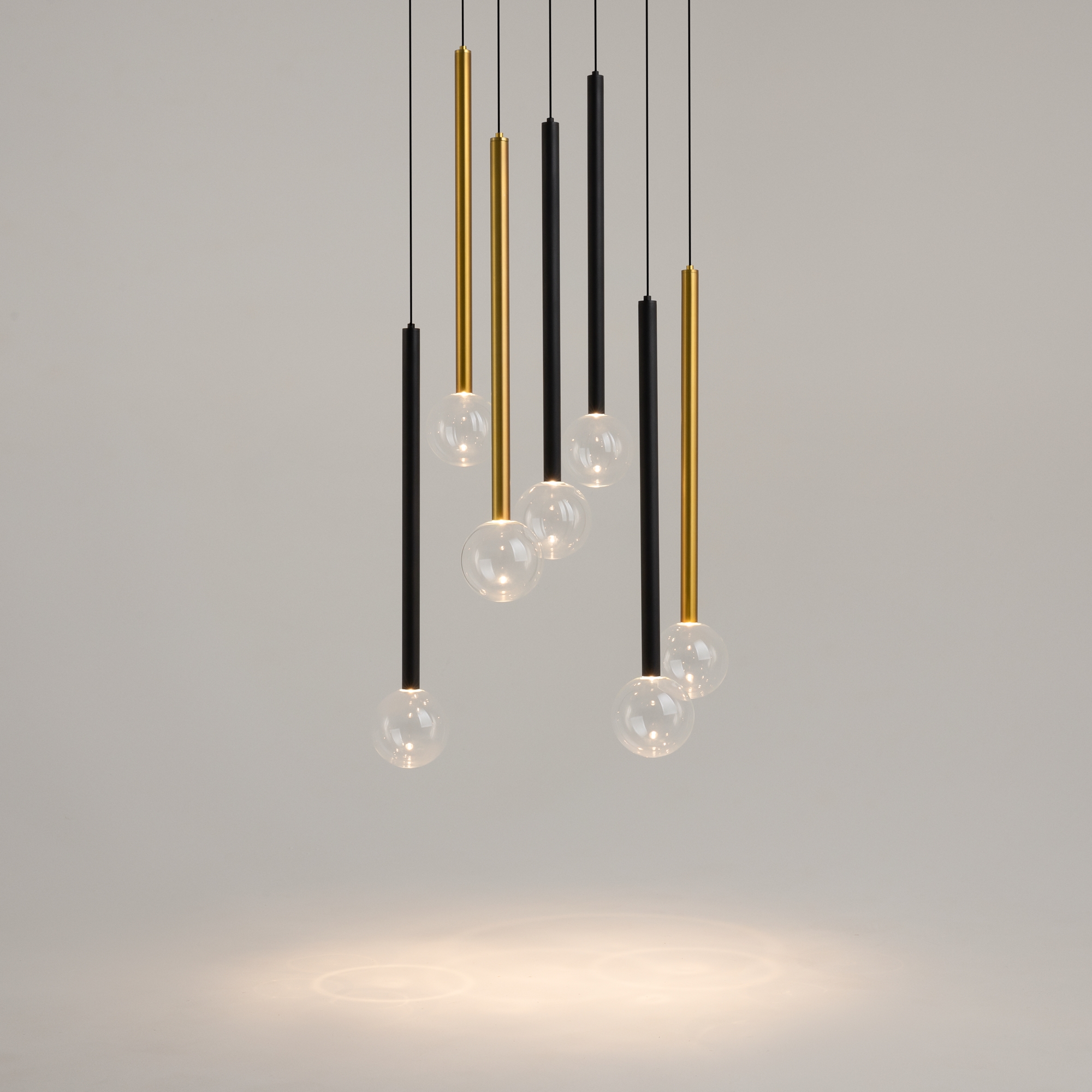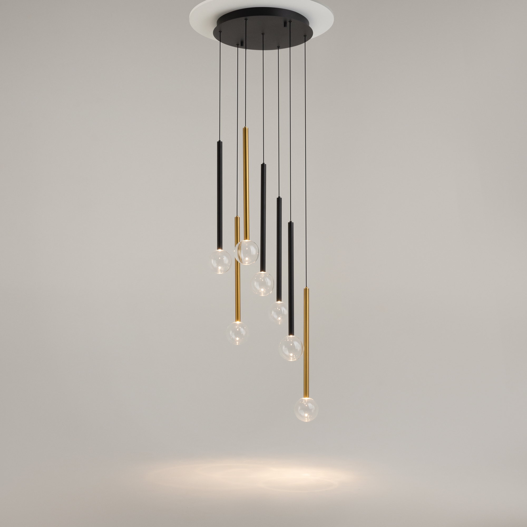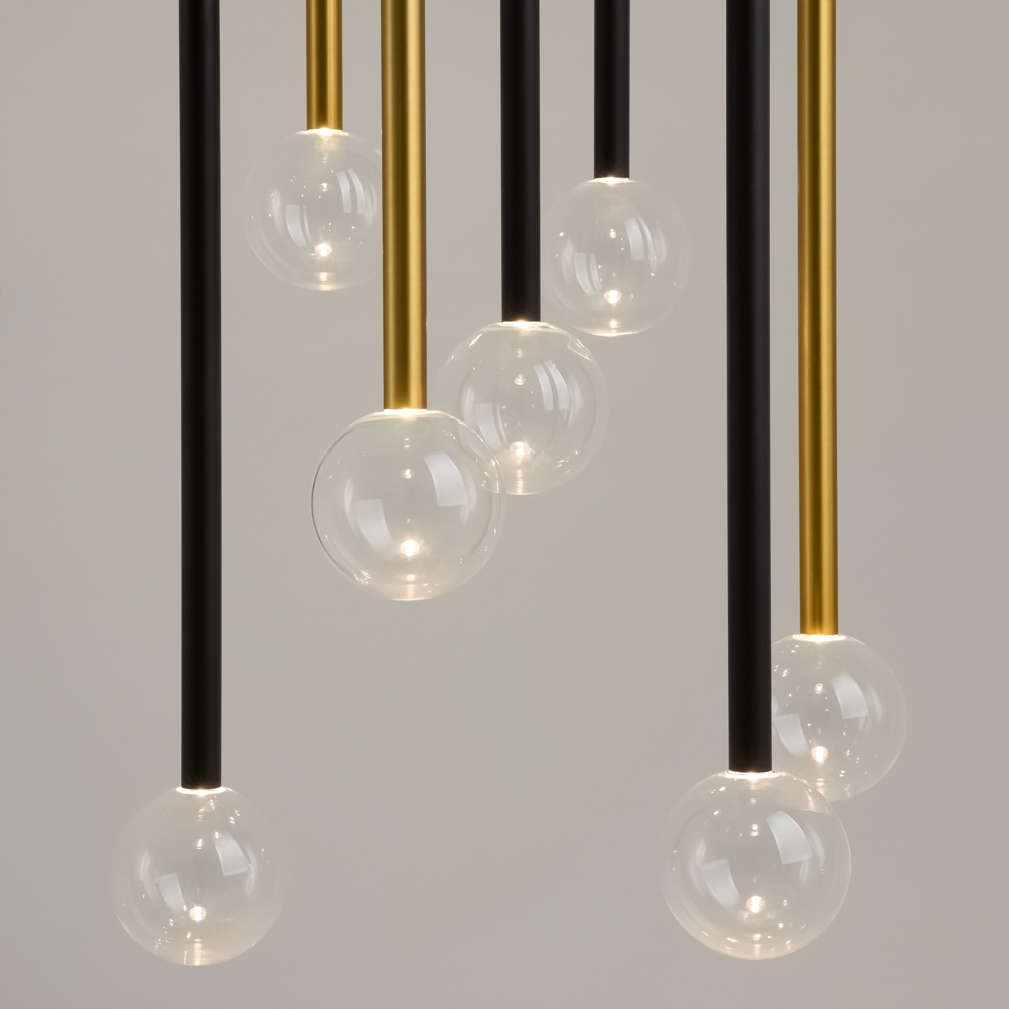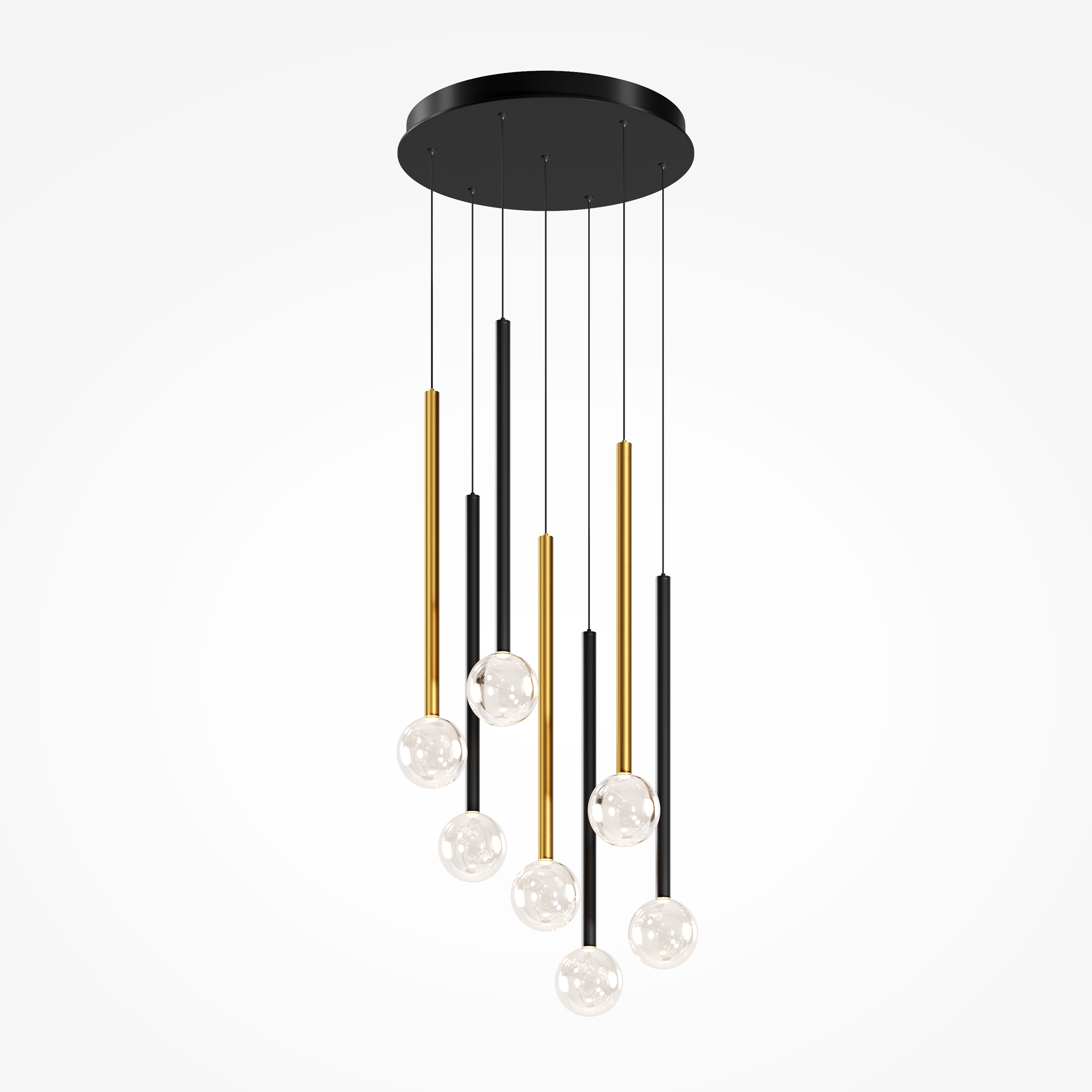 Цвет арматуры — черный, латунь, комбинация черный и латунь. Материал арматуры — металл. Цветовая температура 3000К. Оригинальный «невесомый» дизайн с тонкими металлическими трубками и стеклянными шарами-плафонами. LED-источники света. Регулируемая длина провода подвесных светильников, 3 метра, подходит для помещений с высокими потолками. Каскадная композиция на 7 и 15 плафонов оснащена проводом длиной 3,5 метра для эффектных дизайнерских решений. Подходит для высоких потолков. Парящие модели для создания легкой, воздушной атмосферы в интерьере.