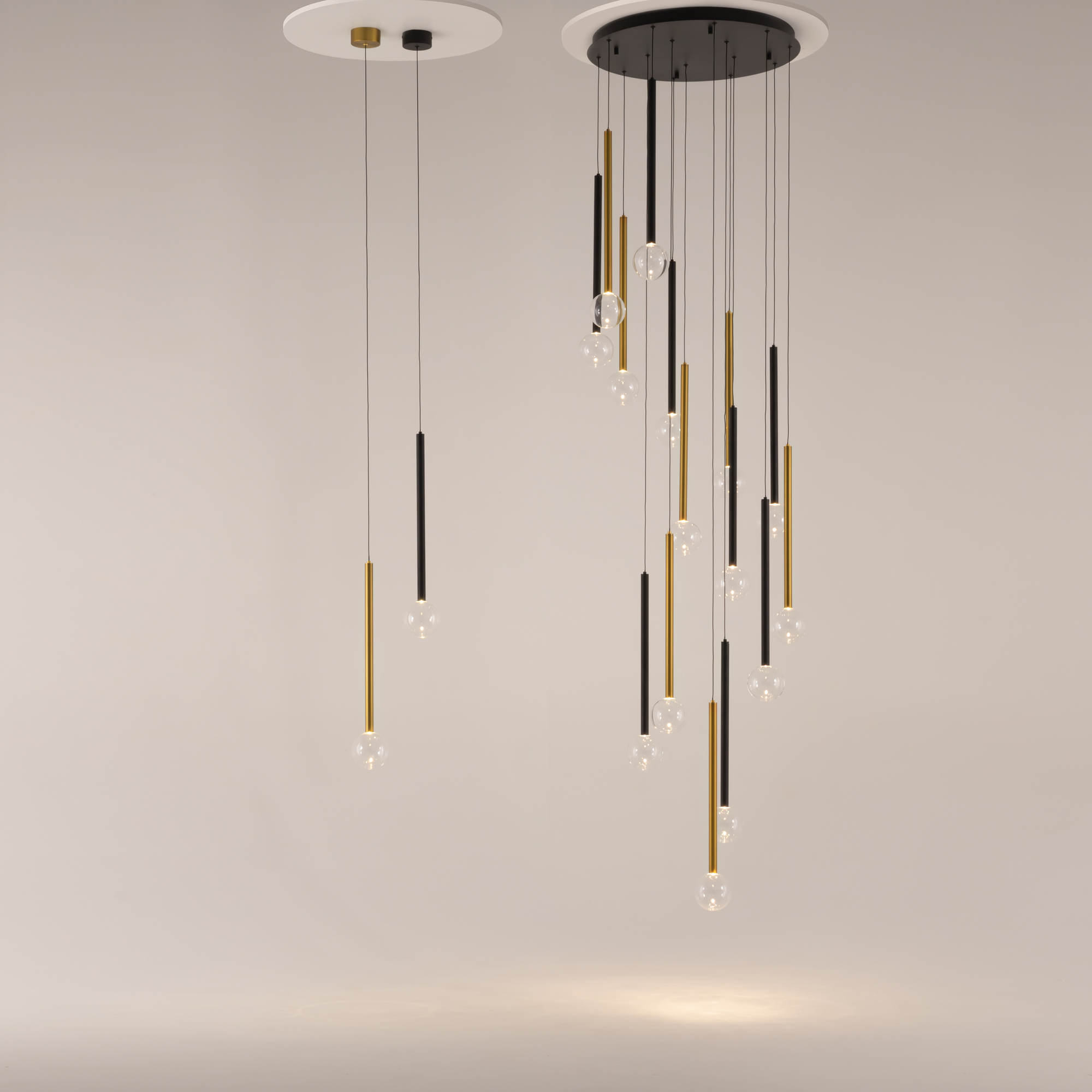 Цвет арматуры — черный, латунь, комбинация черный и латунь. Материал арматуры — металл. Цветовая температура 3000К. Оригинальный «невесомый» дизайн с тонкими металлическими трубками и стеклянными шарами-плафонами. LED-источники света. Регулируемая длина провода подвесных светильников, 3 метра, подходит для помещений с высокими потолками. Каскадная композиция на 7 и 15 плафонов оснащена проводом длиной 3,5 метра для эффектных дизайнерских решений. Подходит для высоких потолков. Парящие модели для создания легкой, воздушной атмосферы в интерьере.