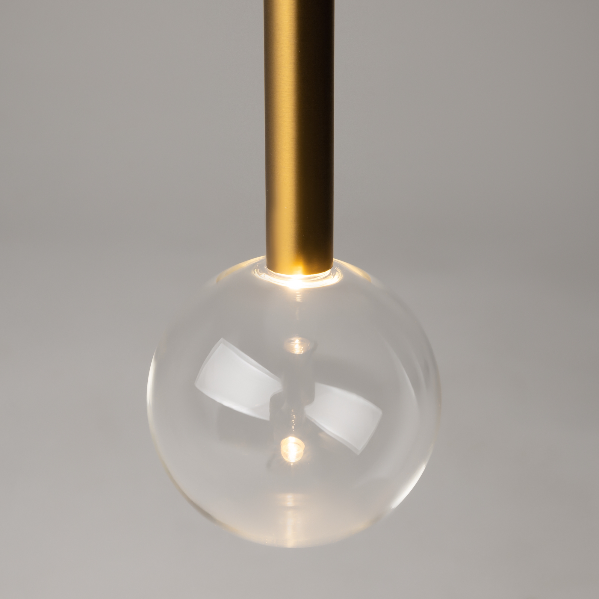 Цвет арматуры — черный, латунь, комбинация черный и латунь. Материал арматуры — металл. Цветовая температура 3000К. Оригинальный «невесомый» дизайн с тонкими металлическими трубками и стеклянными шарами-плафонами. LED-источники света. Регулируемая длина провода подвесных светильников, 3 метра, подходит для помещений с высокими потолками. Каскадная композиция на 7 и 15 плафонов оснащена проводом длиной 3,5 метра для эффектных дизайнерских решений. Подходит для высоких потолков. Парящие модели для создания легкой, воздушной атмосферы в интерьере.