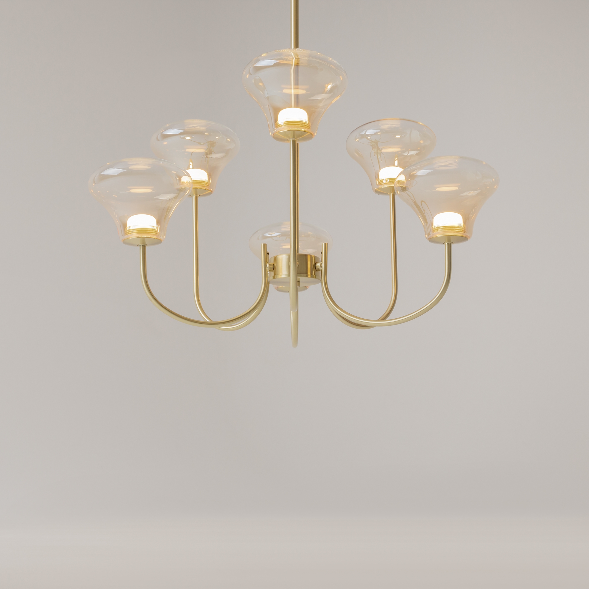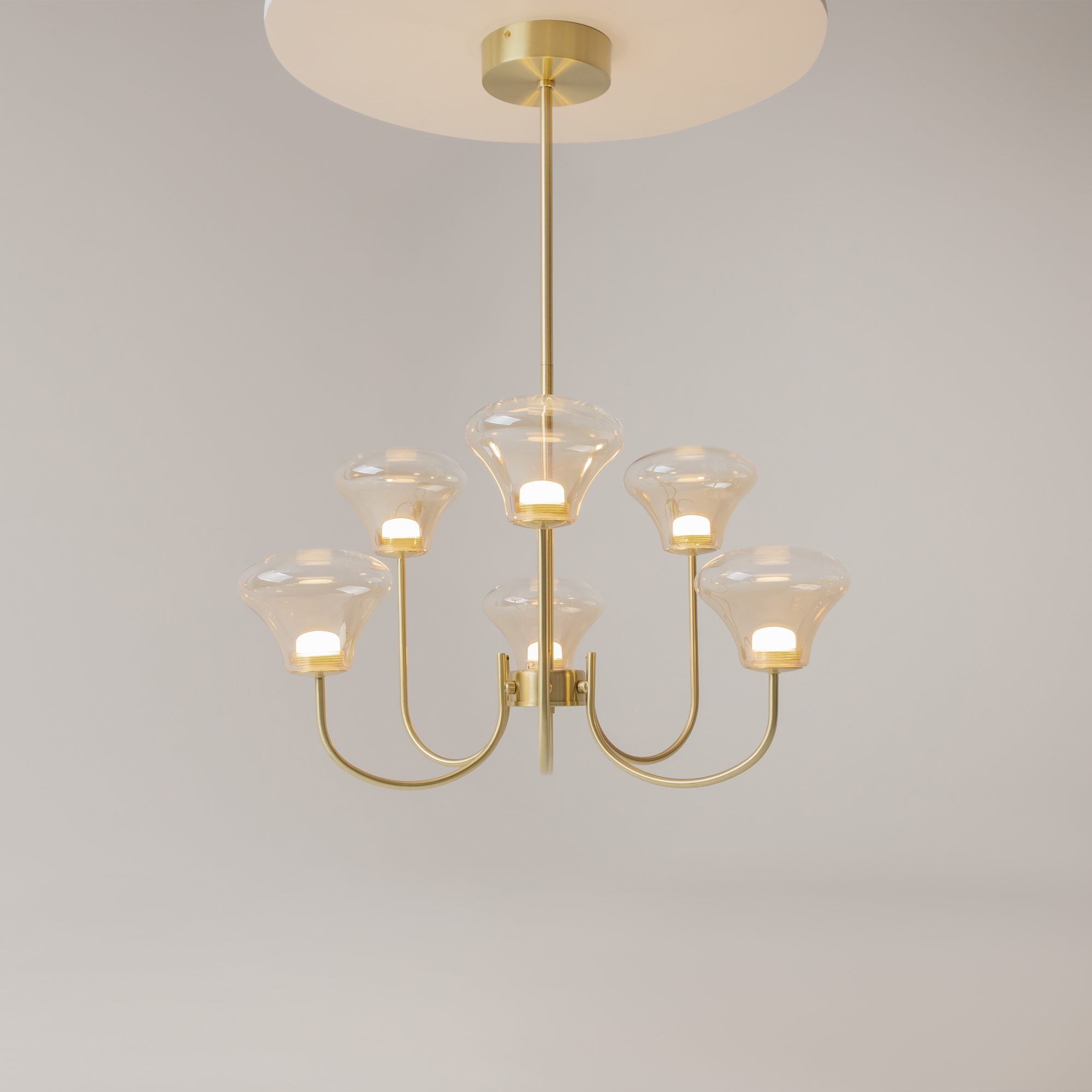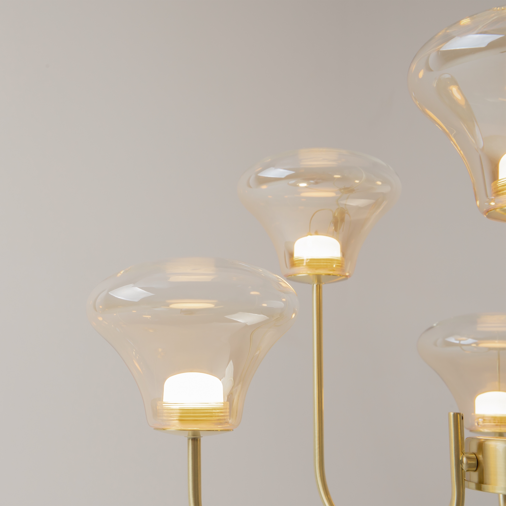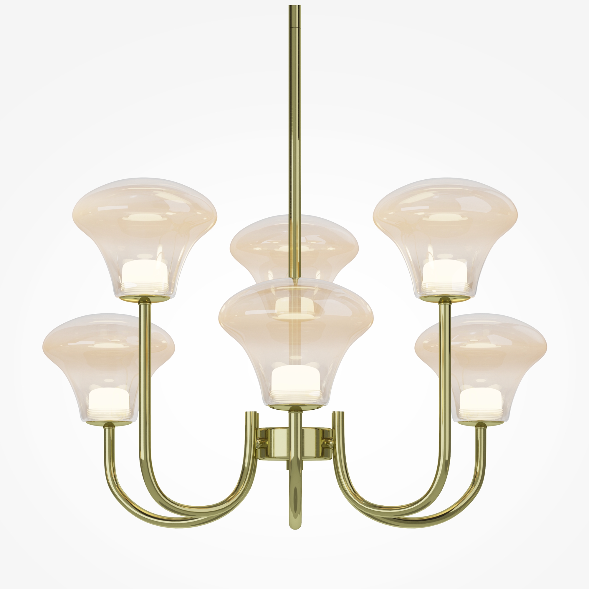 Серия Dynasty вдохновлена атмосферой бальных залов и представлена подвесными светильниками (люстры) на 6 и 8 плафонов, настенным светильником (бра). Обтекаемая форма плафона с градиентом от янтарного к прозрачному. Арочный дизайн металлической арматуры в цвете сатинированной латуни. Блеск металла и глянец стекла дополнены светом LED-источника (3000K). Высота люстр регулируется разборной штангой. Светильники Dynasty станут ярким акцентом в гостиной, столовой, спальне, рабочем кабинете или прихожей.