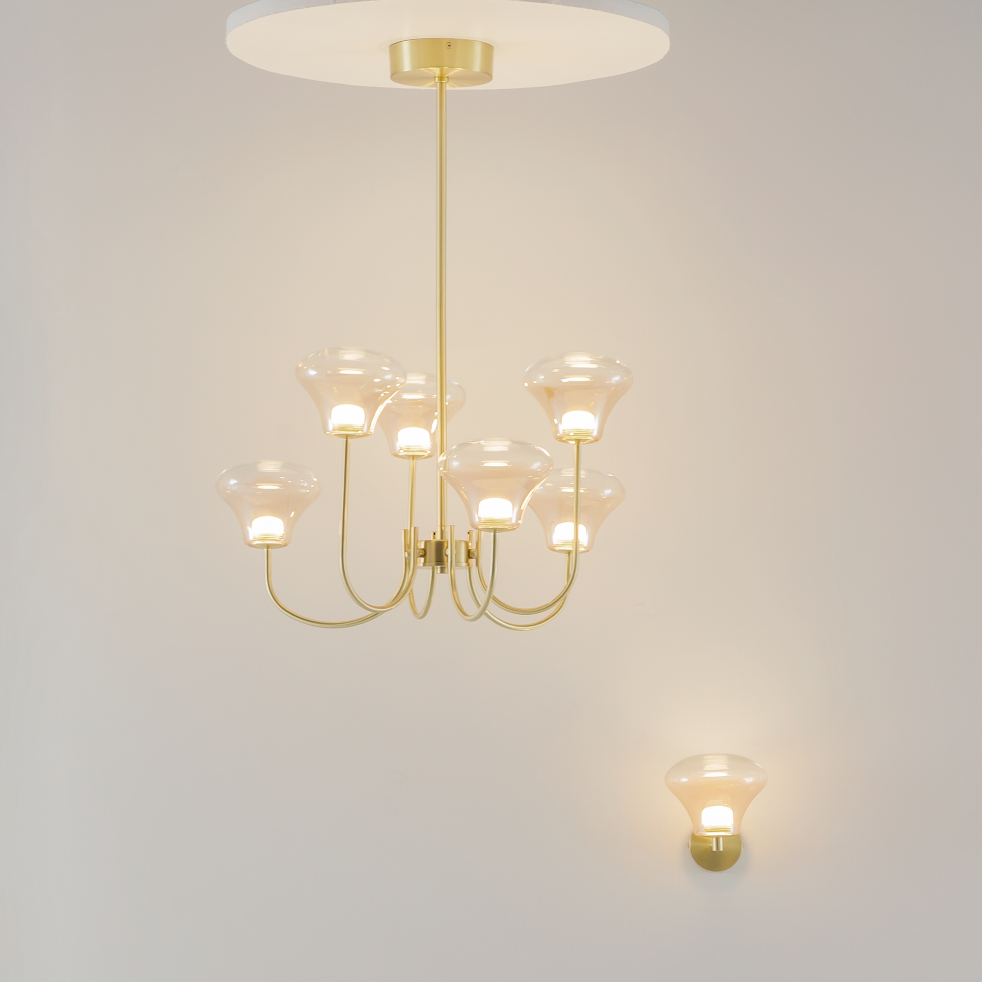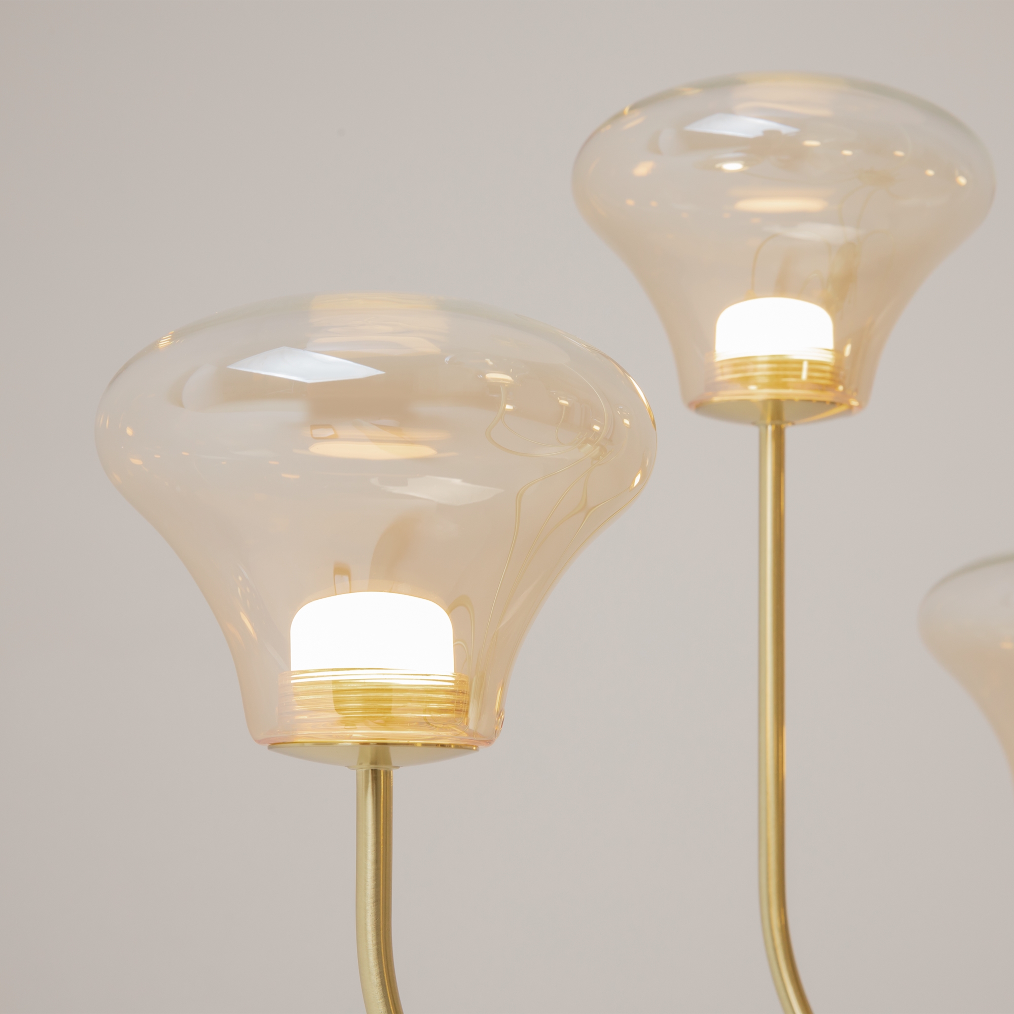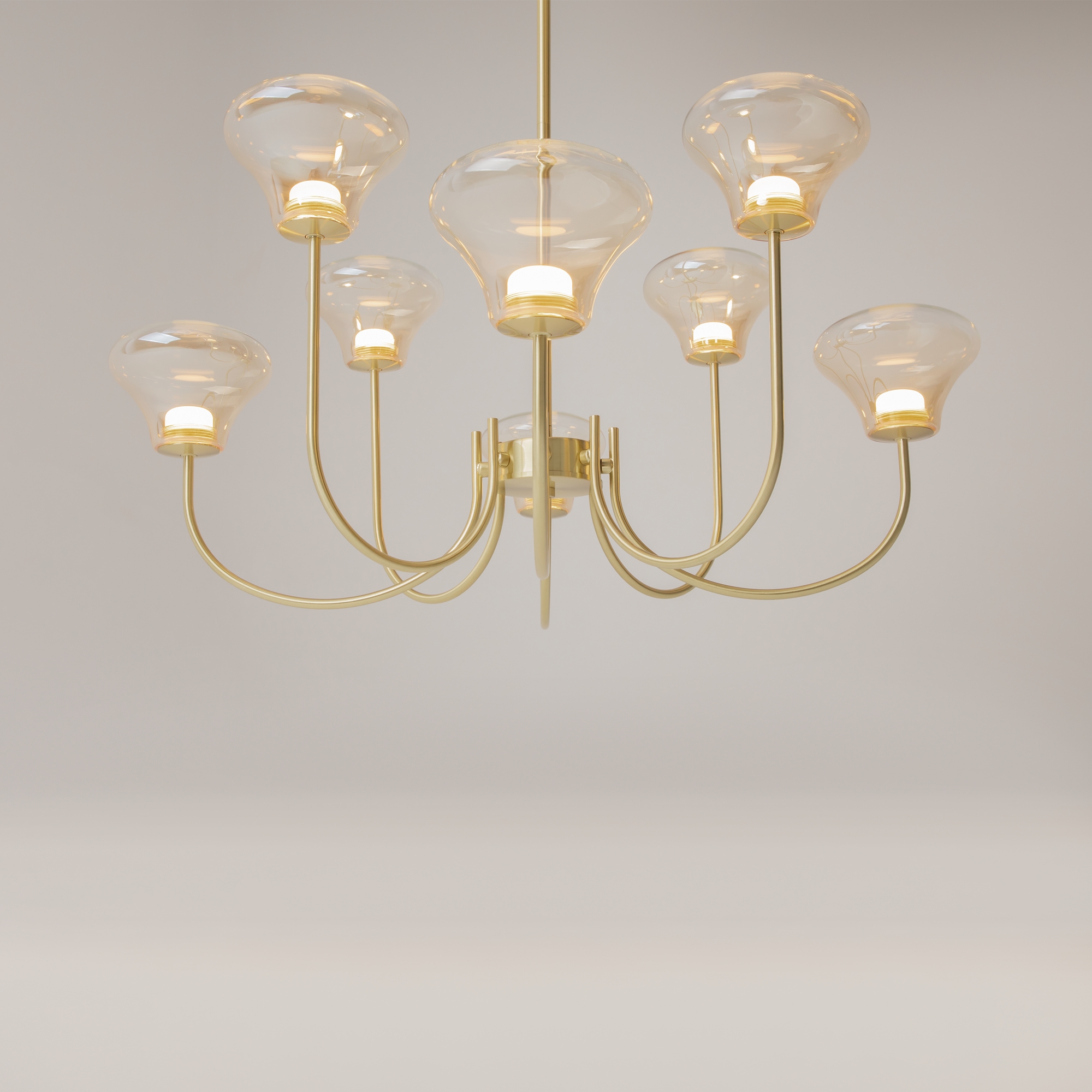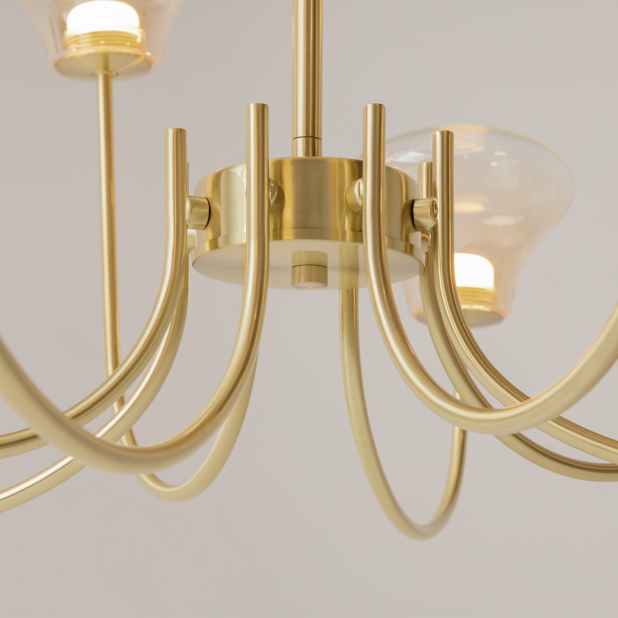 Серия Dynasty вдохновлена атмосферой бальных залов и представлена подвесными светильниками (люстры) на 6 и 8 плафонов, настенным светильником (бра). Обтекаемая форма плафона с градиентом от янтарного к прозрачному. Арочный дизайн металлической арматуры в цвете сатинированной латуни. Блеск металла и глянец стекла дополнены светом LED-источника (3000K). Высота люстр регулируется разборной штангой. Светильники Dynasty станут ярким акцентом в гостиной, столовой, спальне, рабочем кабинете или прихожей.