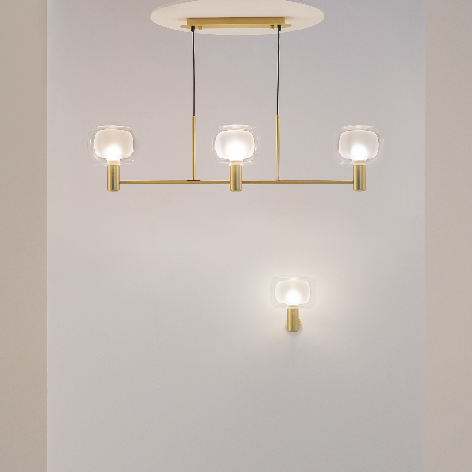 Арматура – алюминий, цвет – золото. Двойной стеклянный плафон: внутренний – матовый, внешний – прозрачный. Стиль – итальянская неоклассика. Культовые формы 60-х в дизайне.
