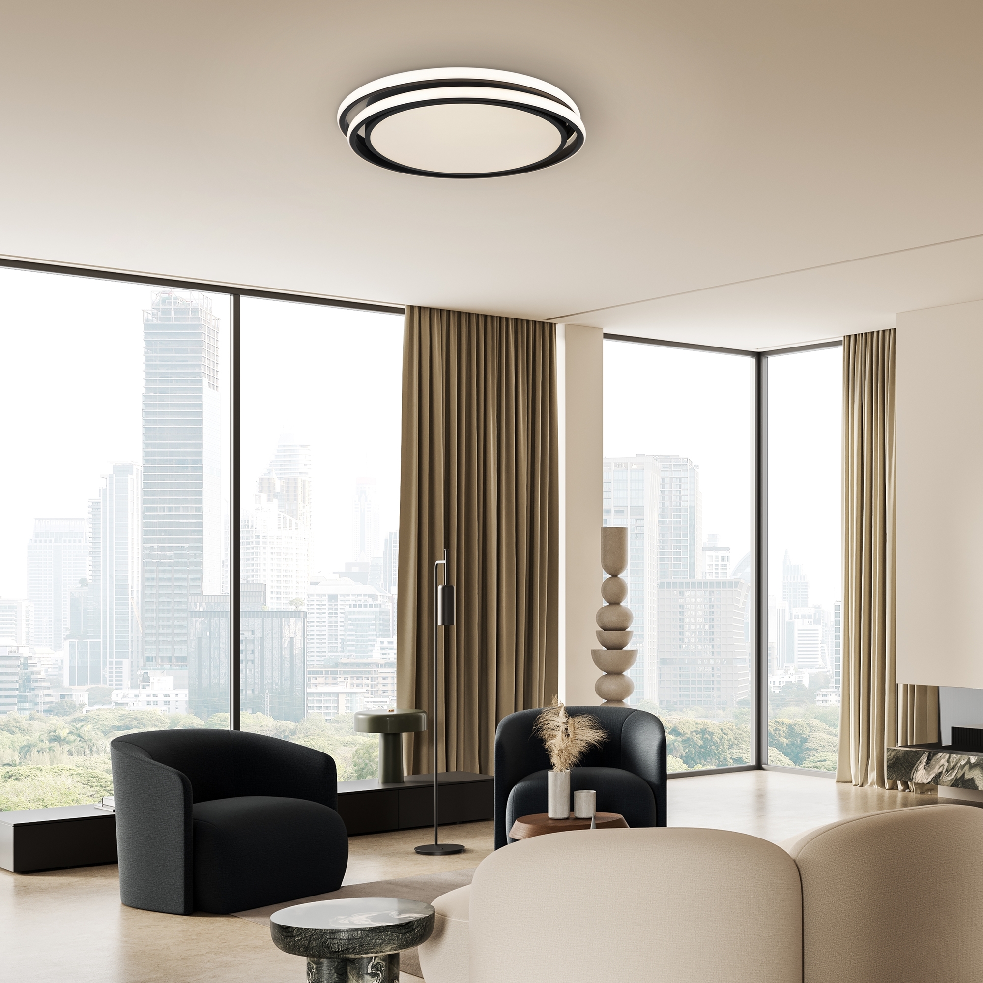 Арматура из металла и акрила. Цвет – черный. Трендовый элемент дизайна – кольца, расположенные под необычным углом. Энергоэффективный LED-источник дает яркую и комфортную для зрения подсветку.