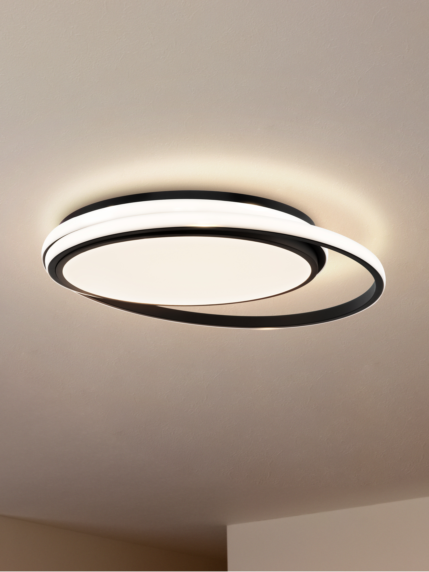 Арматура из металла и акрила. Цвет – черный. Трендовый элемент дизайна – кольца, расположенные под необычным углом. Энергоэффективный LED-источник дает яркую и комфортную для зрения подсветку.