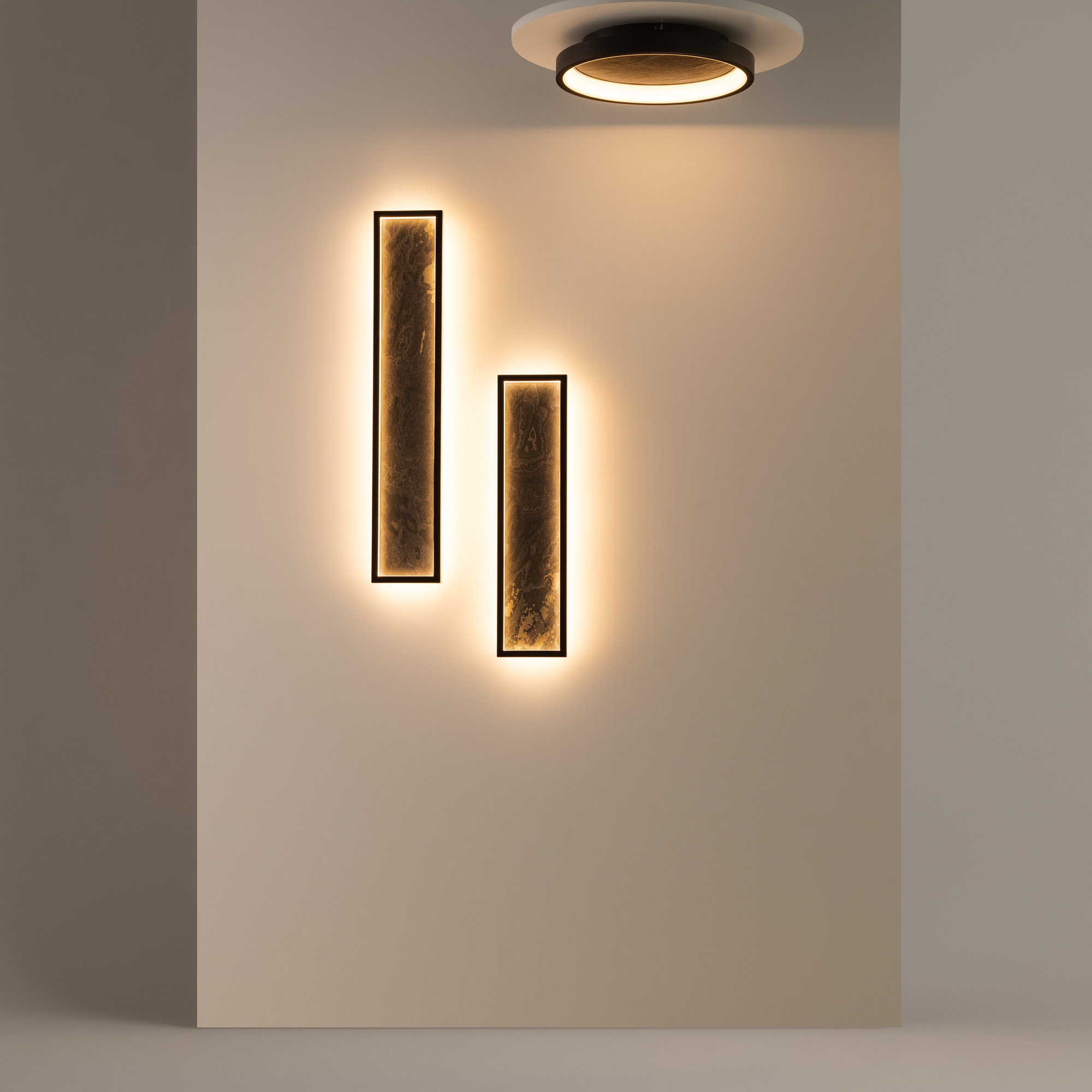 Сочетание первозданных материалов и современных технологий освещения. Корпус из натурального камня серого цвета с естественным рисунком и прожилками, подсвеченный LED-источником света с температурой 3000К. Цвет арматуры — черный. Материал арматуры — металл. Светодиодный источник света. Два размера потолочных и настенных моделей. Игра света и тени подчеркивает природный рельеф камня. Высокий индекс цветопередачи >90 Ra для естественного освещения.