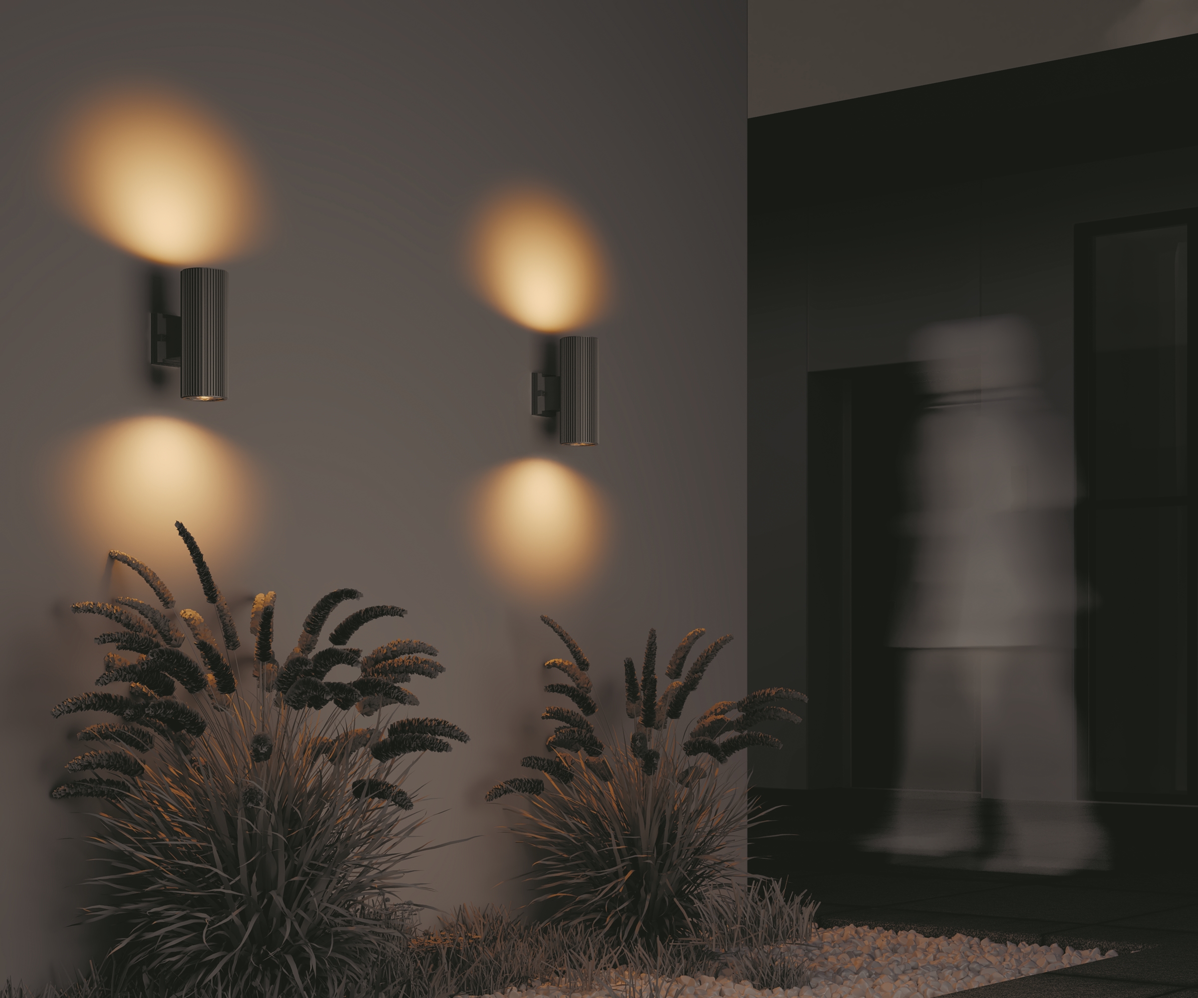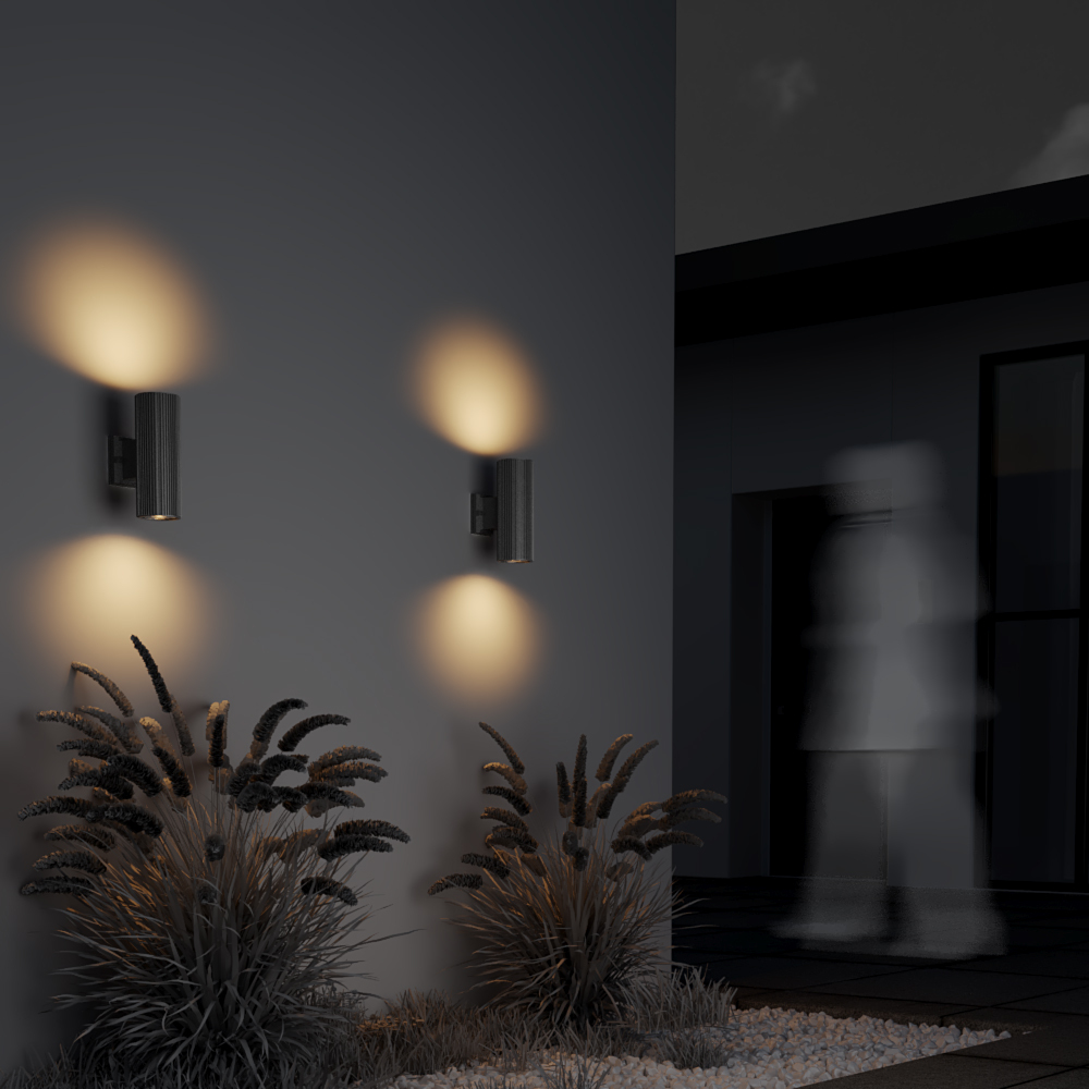 Фактурные настенные светильники для архитектурной подсветки. Металлический корпус устойчив к коррозии. IP 54 обеспечивает высокий уровень защиты от пыли и влаги. Комплектация светильников позволяет настраивать двухсторонний и однонаправленный световой поток. В серии представлены модели, рассчитанные на 1 и 2 лампы (Е27). Три оттенка на выбор: черный, серый, белый.