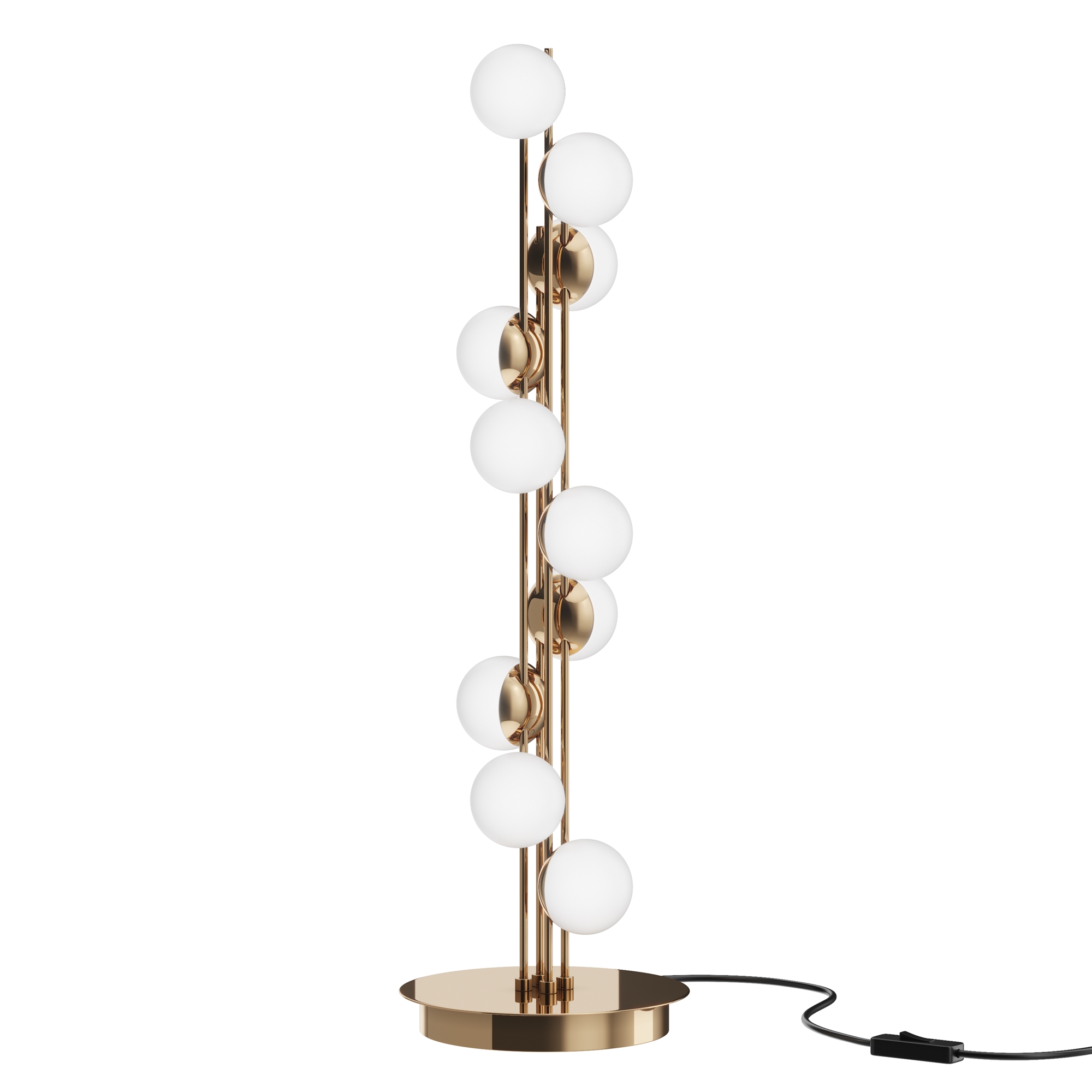Арматура из металла в золотом цвете. Плафоны-сферы — белый пластик. Дизайн с имитацией молекулярной структуры. LED-источники света.