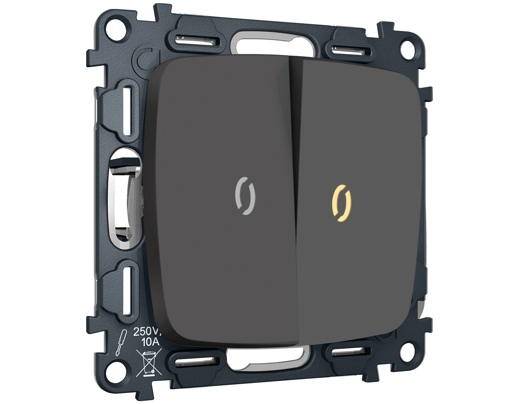 Комплект механизма 2-клавишного проходного выключателя с подсветкой 3200K OMEGA MO904030 Графит мягкое касание QUANT