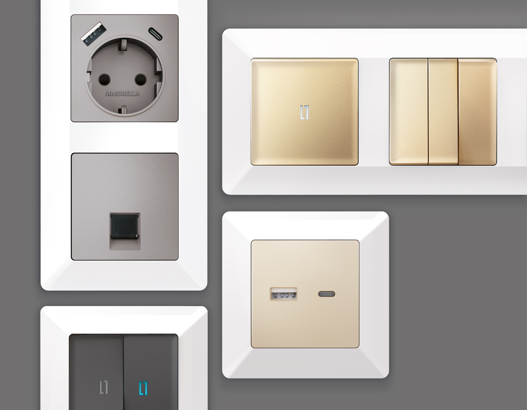 Многогранный ассортимент Ambrella Volt включает в себя механизмы, лицевые панели и рамки, а также комплекты, доступные в различных цветовых решениях. Продукция представлена в модульном исполнении, что позволяет гибко настраивать внешнийвид и функциональность. Вам будет легко заменить лицевую панель, рамку или механизм, найдя идеальное сочетание цветов.