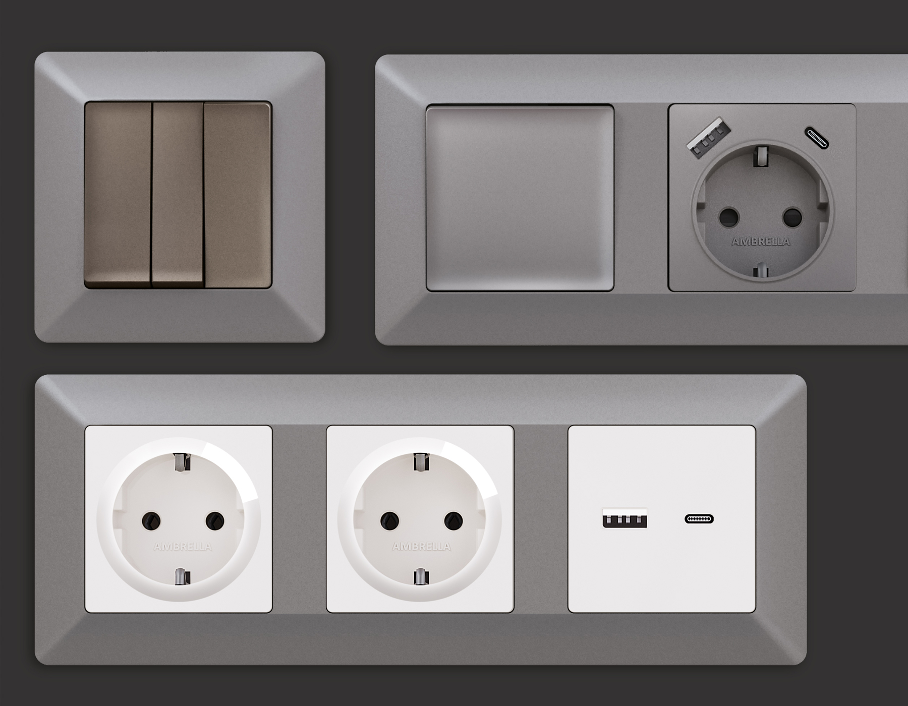 Многогранный ассортимент Ambrella Volt включает в себя механизмы, лицевые панели и рамки, а также комплекты, доступные в различных цветовых решениях. Продукция представлена в модульном исполнении, что позволяет гибко настраивать внешнийвид и функциональность. Вам будет легко заменить лицевую панель, рамку или механизм, найдя идеальное сочетание цветов.