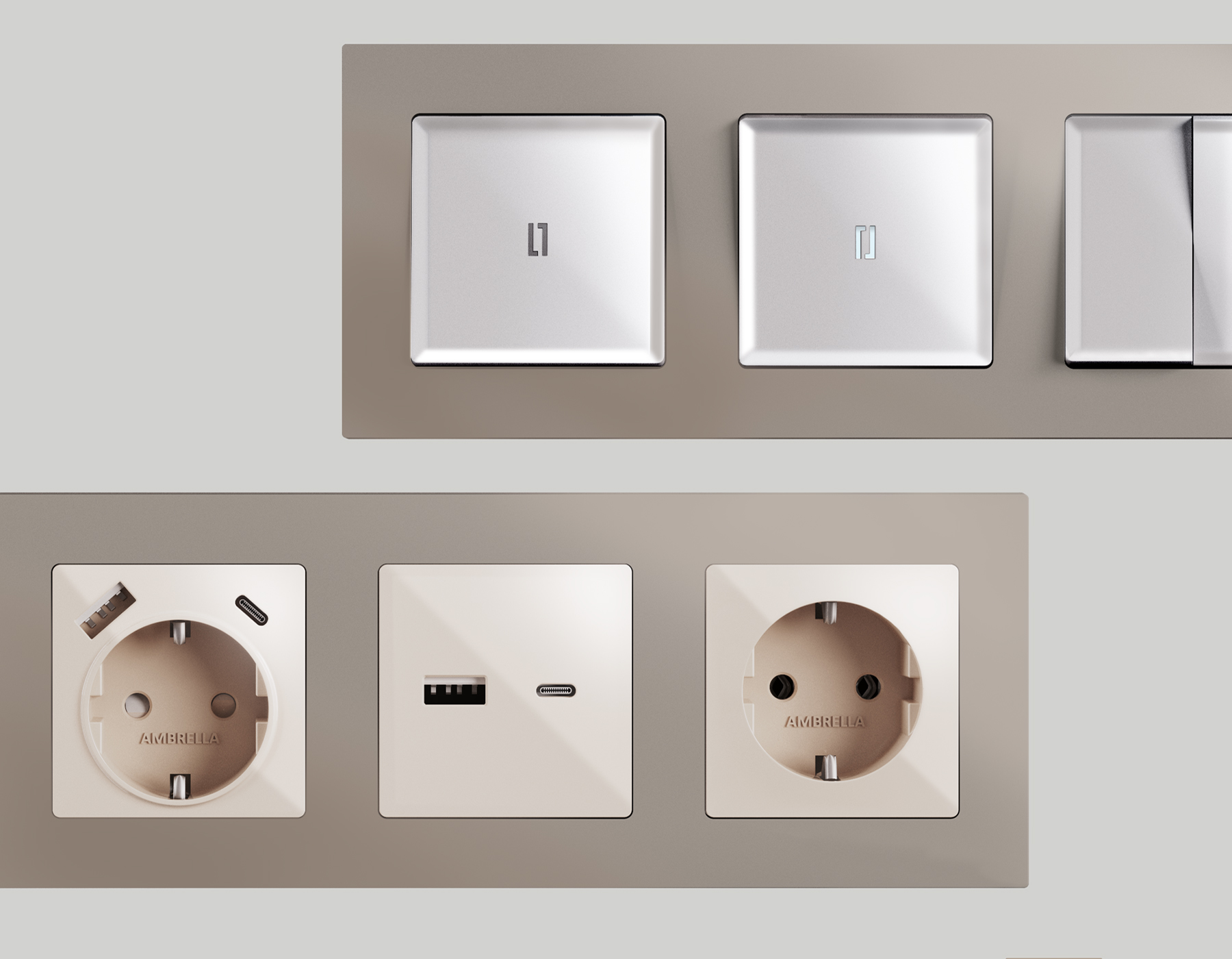 Многогранный ассортимент Ambrella Volt включает в себя механизмы, лицевые панели и рамки, а также комплекты, доступные в различных цветовых решениях. Продукция представлена в модульном исполнении, что позволяет гибко настраивать внешнийвид и функциональность. Вам будет легко заменить лицевую панель, рамку или механизм, найдя идеальное сочетание цветов.