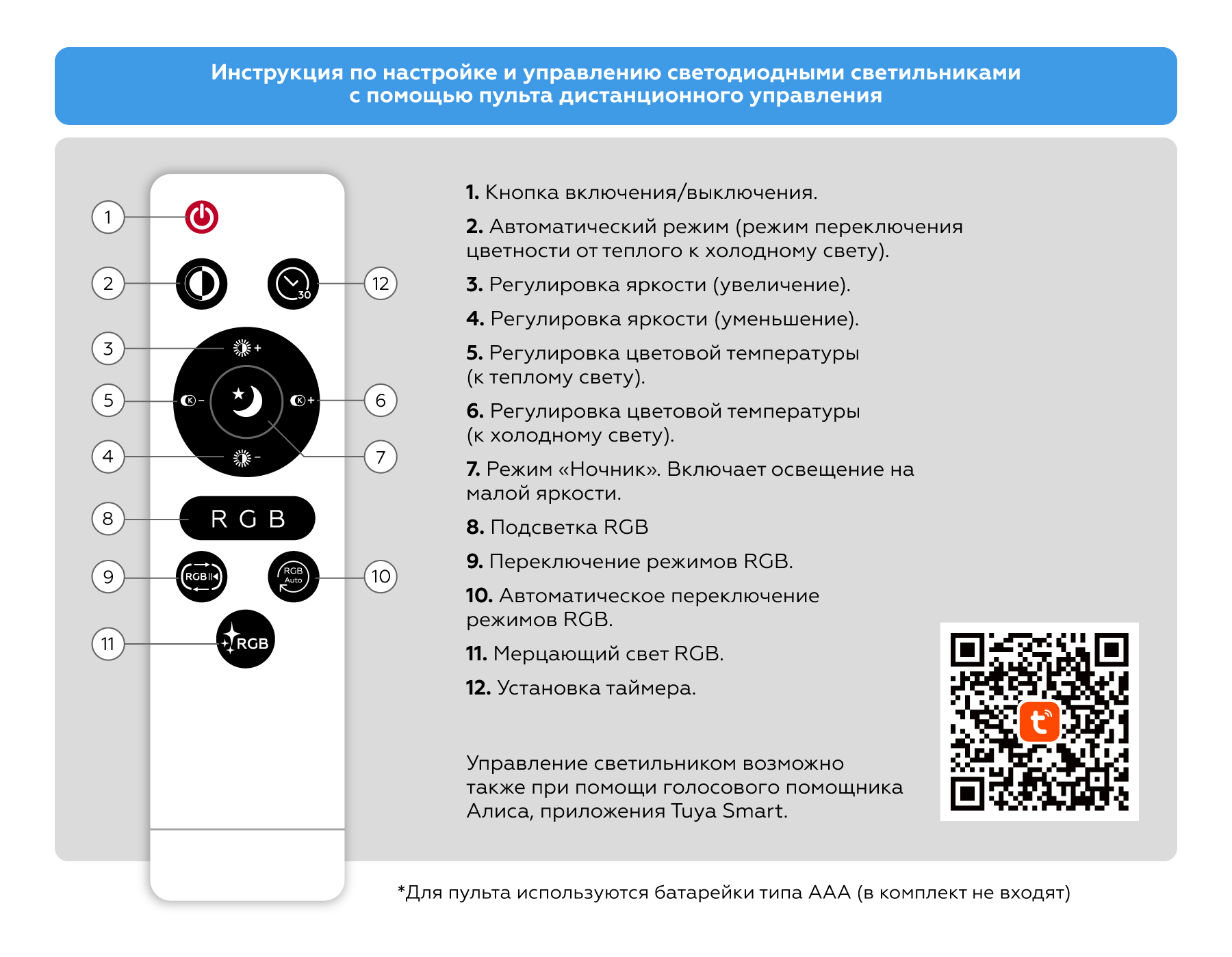 диммирование, изменение цветовой температуры, ночной режим, таймер, режим памяти