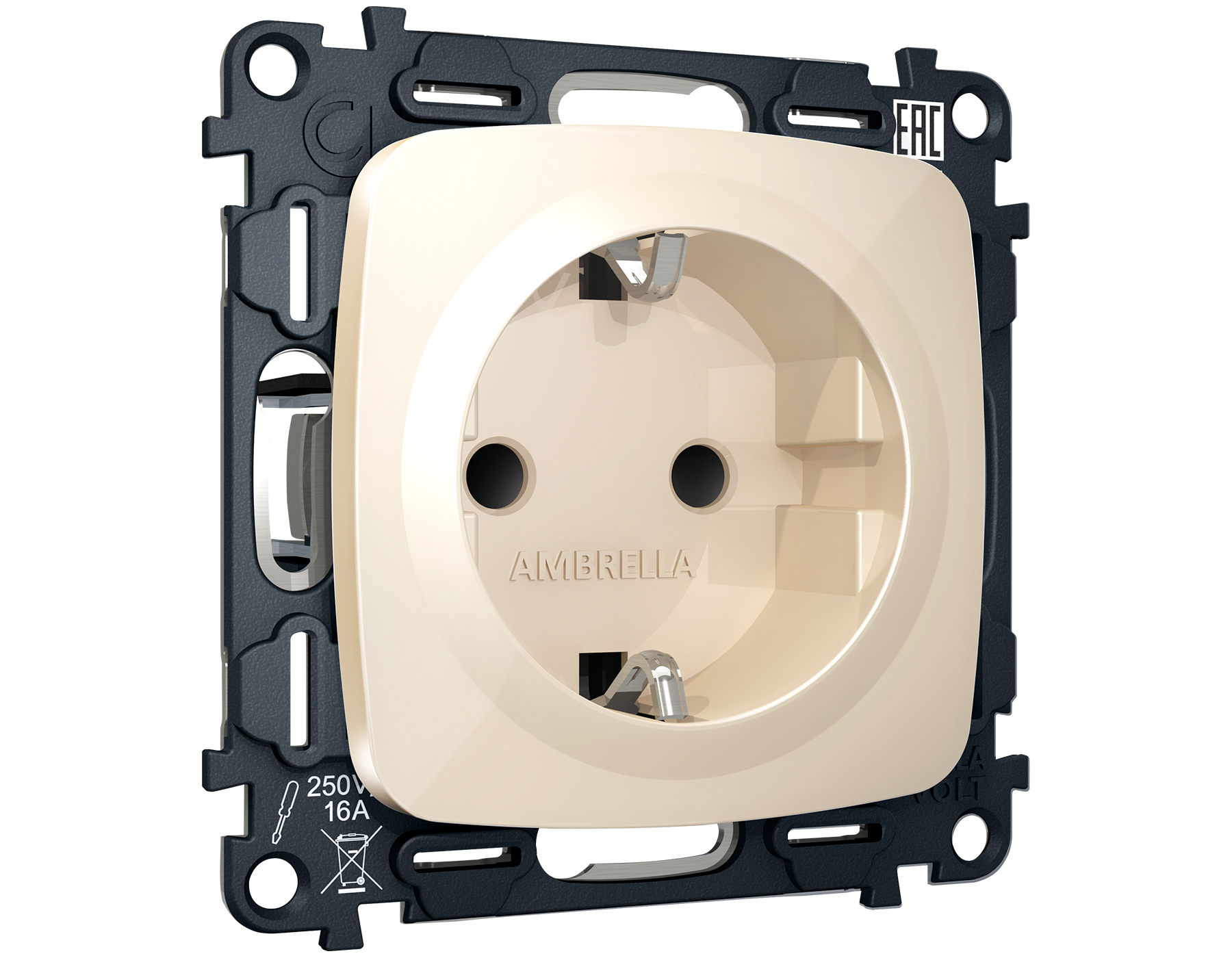 Комплект механизма электрической розетки OMEGA MO307010 Бежевый глянец с заземлением и шторками 2P+E 16A-250V QUANT