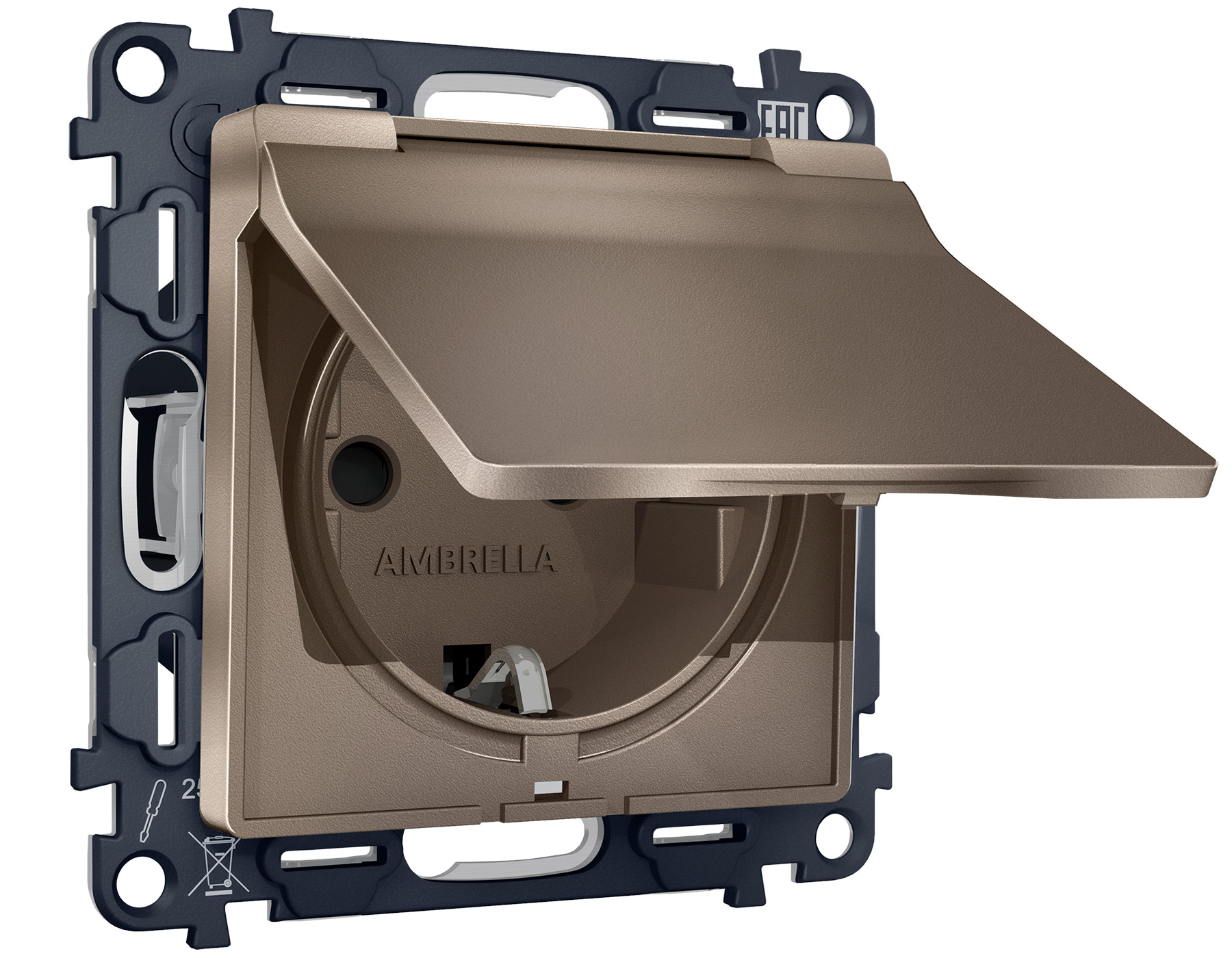 Комплект механизма электрической розетки ALFA MA638010 Темная бронза матовый с заземлением с шторками и защитной крышкой 2P+E 16A-250V IP44 QUANT