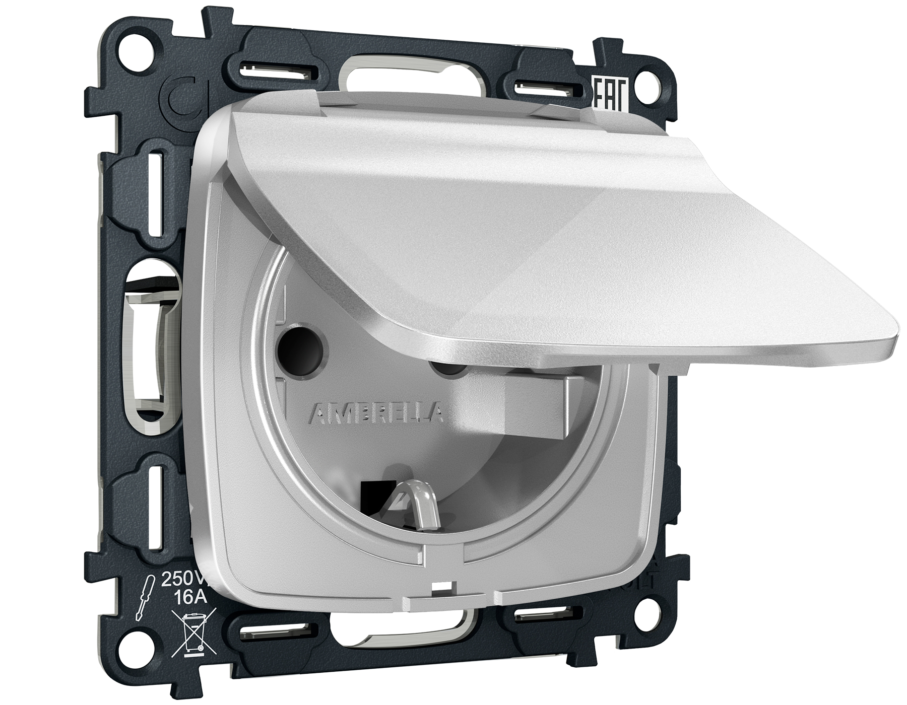 Комплект механизма электрической розетки OMEGA MO408010 Серебро глянец с заземлением с шторками и защитной крышкой 2P+E 16A-250V IP44 QUANT