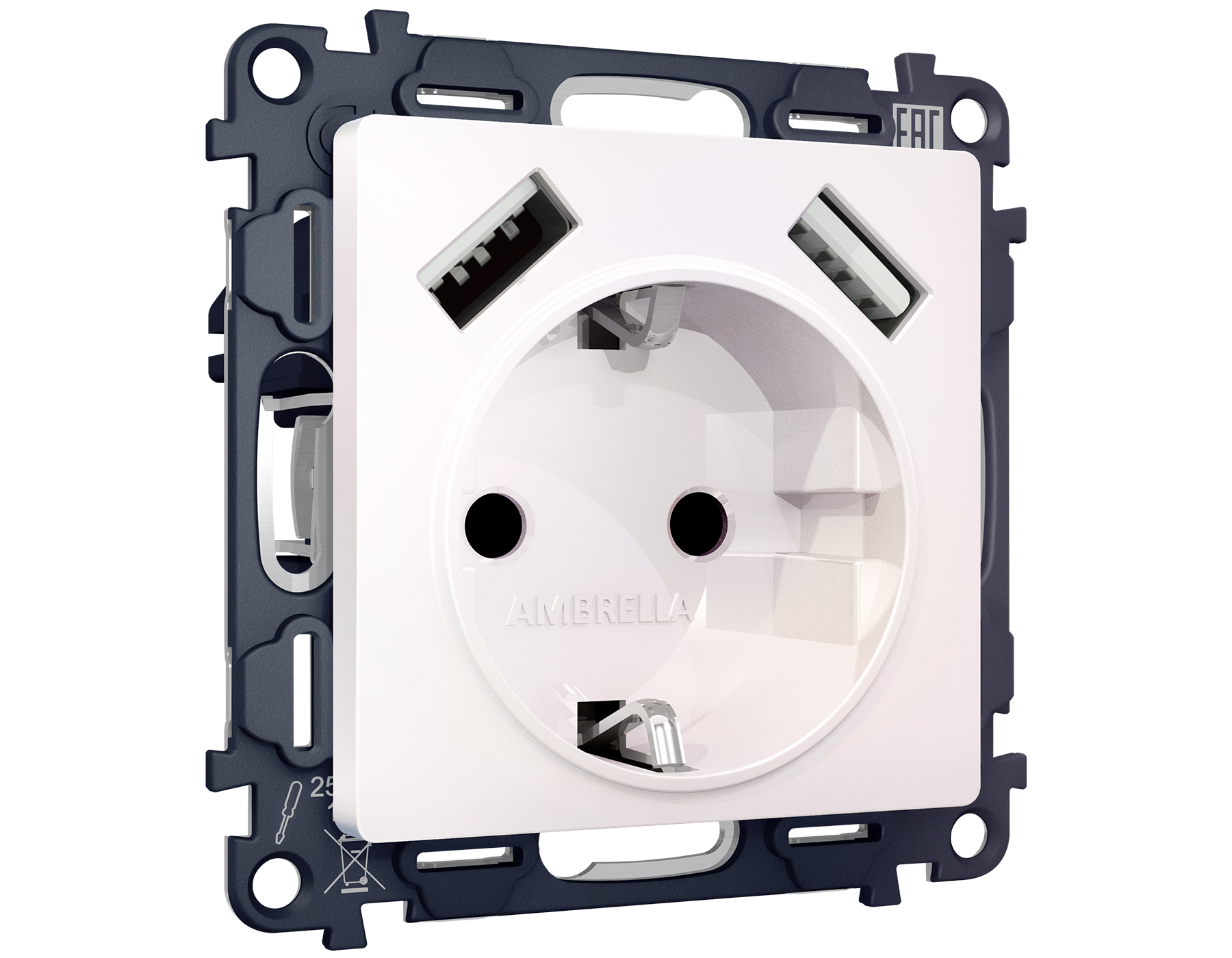 Комплект механизма электрической розетки ALFA MA209010 Жемчуг 2USB A+A 18W быстрая зарядка с заземлением и шторками 2P+E 16A-250V QUANT