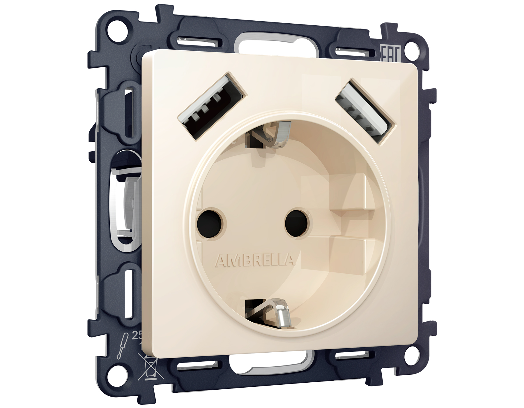 Комплект механизма электрической розетки ALFA MA309010 Бежевый глянец 2USB A+A 18W быстрая зарядка с заземлением и шторками 2P+E 16A-250V QUANT
