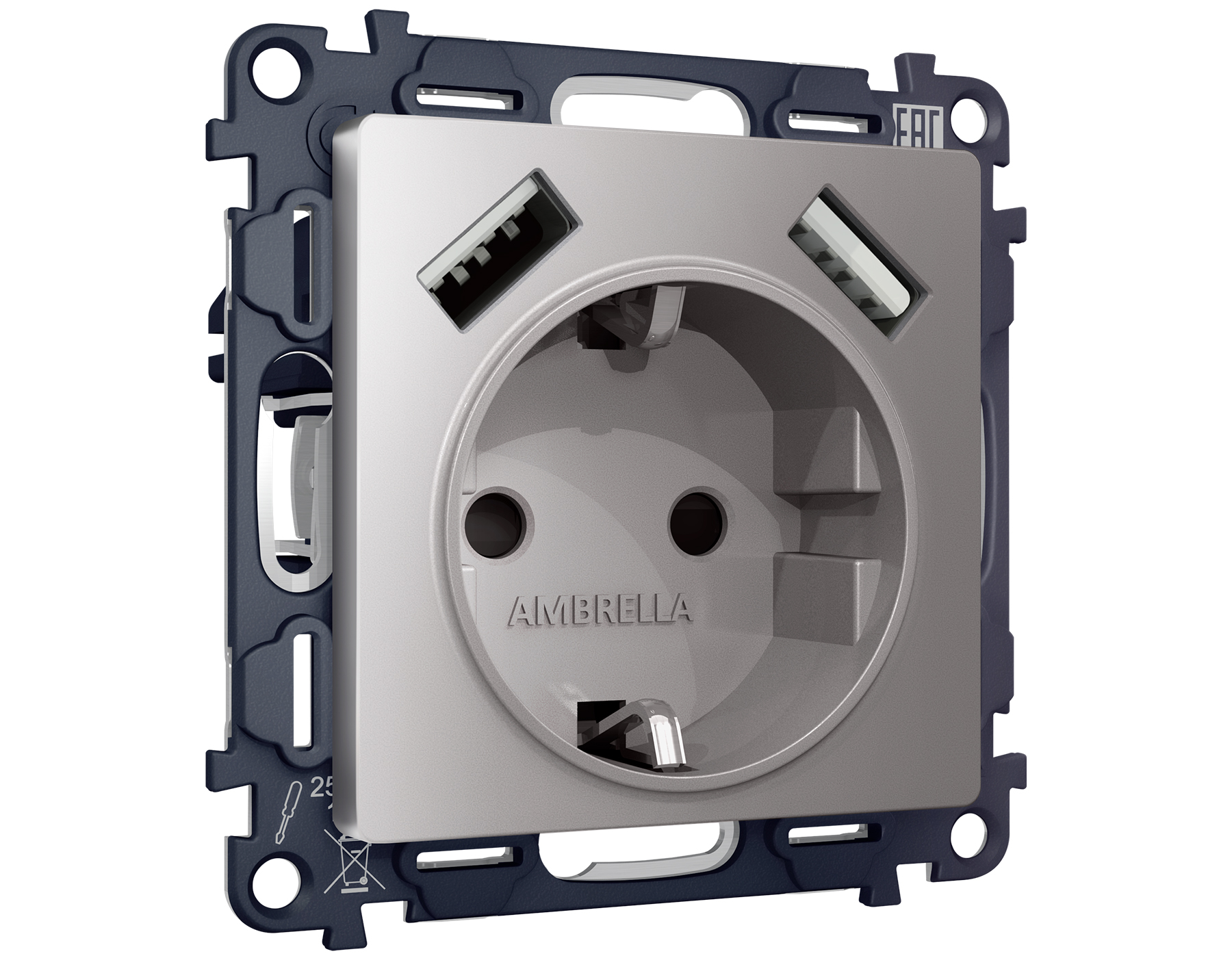 Комплект механизма электрической розетки ALFA MA509010 Сталь матовый 2USB A+A 18W быстрая зарядка с заземлением и шторками 2P+E 16A-250V QUANT