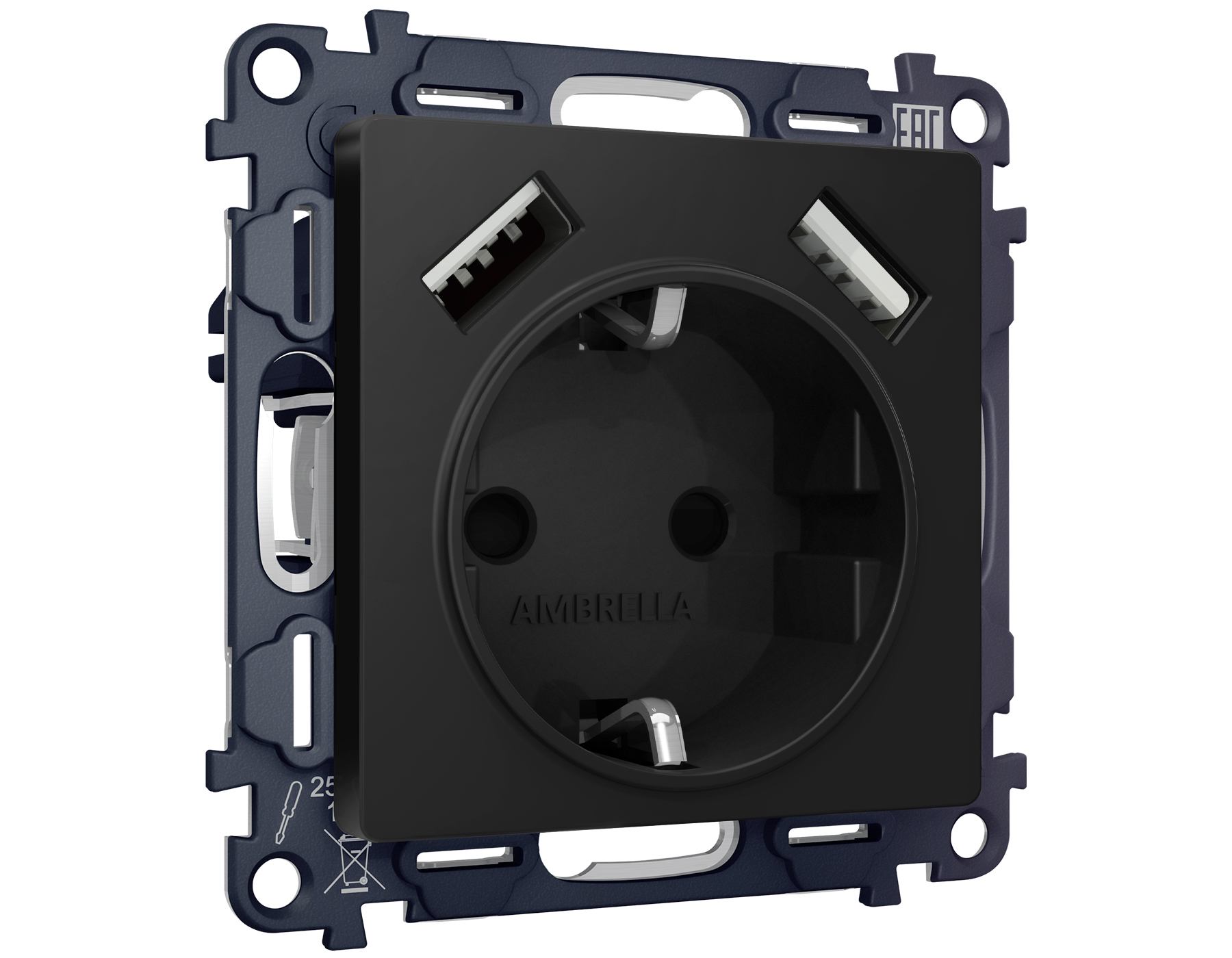 Комплект механизма электрической розетки ALFA MA809010 Черный матовый 2USB A+A 18W быстрая зарядка с заземлением и шторками 2P+E 16A-250V QUANT