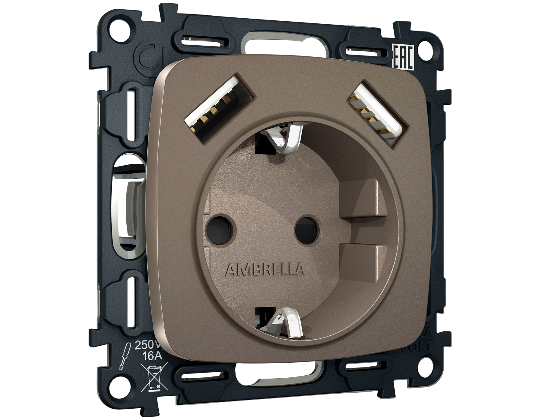 Комплект механизма электрической розетки OMEGA MO639010 Темная бронза матовый 2USB A+A 18W быстрая зарядка с заземлением и шторками 2P+E 16A-250 QUANT