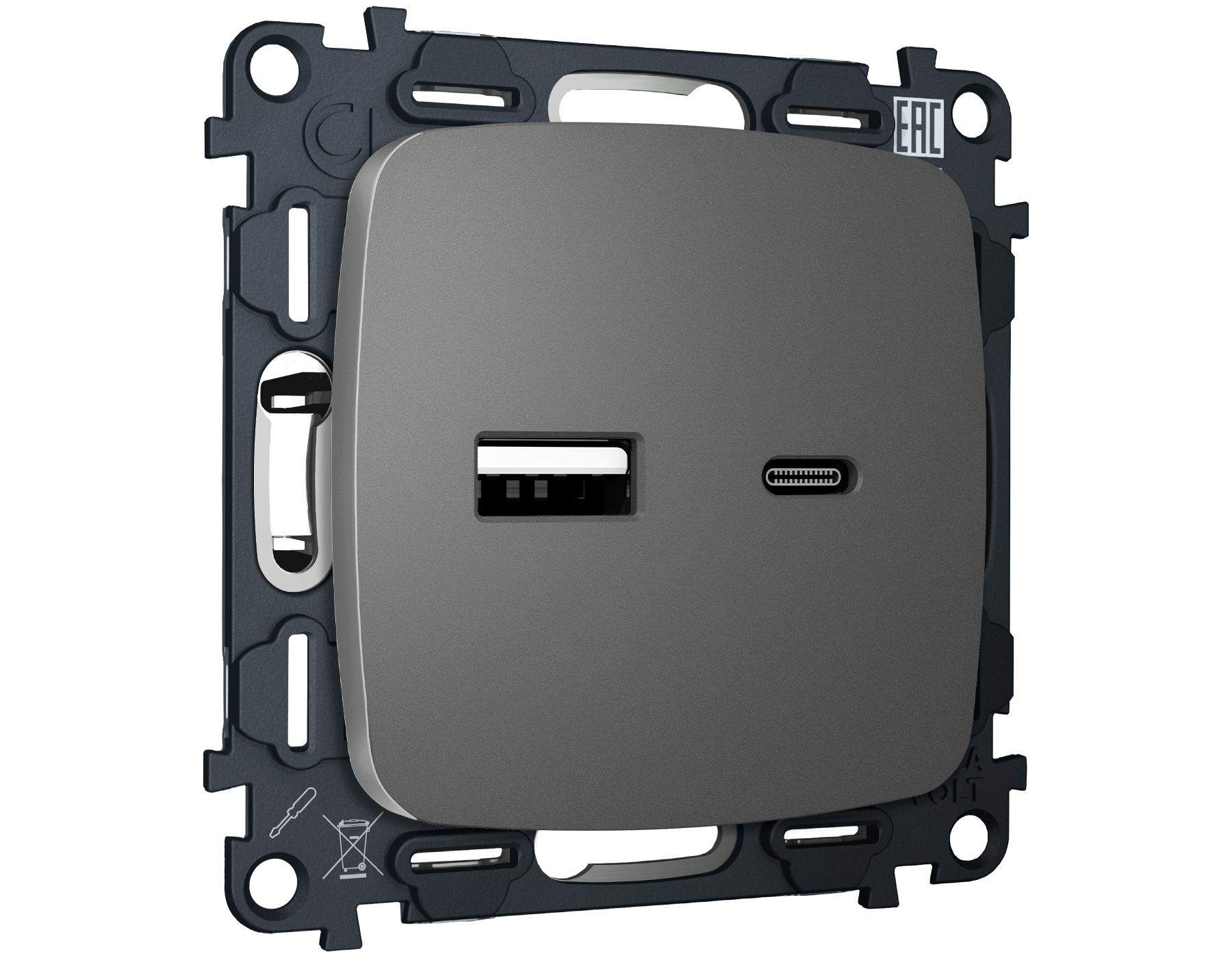 Комплект механизма розетки OMEGA MO661010 Антрацит серый 2USB A+C 20W быстрая зарядка QUANT