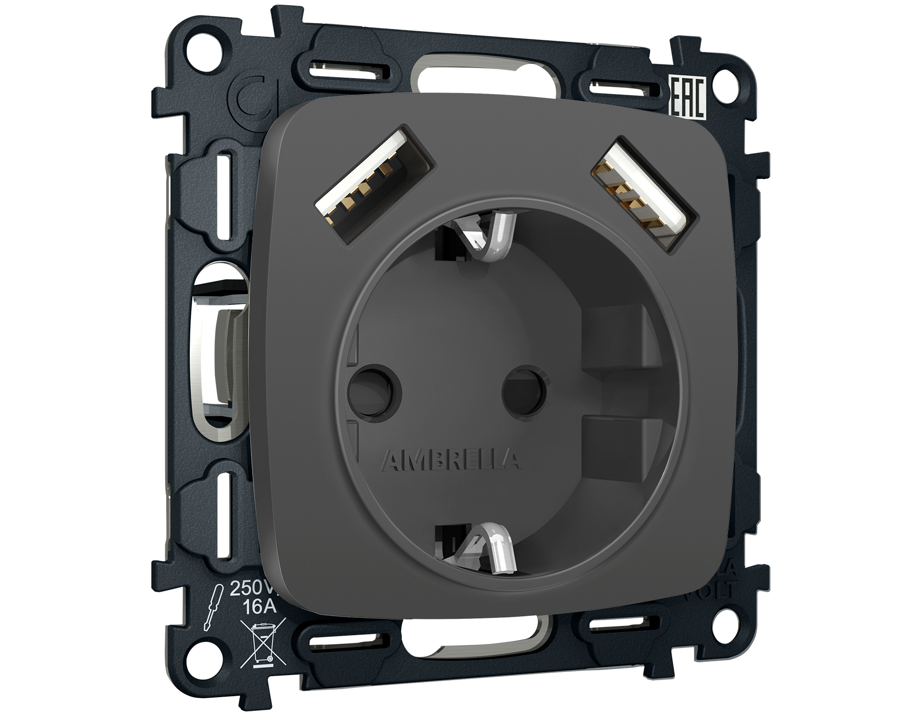 Комплект механизма электрической розетки OMEGA MO909010 Графит мягкое касание 2USB A+A 18W быстрая зарядка с заземлением и шторками 2P+E 16A-250 QUANT