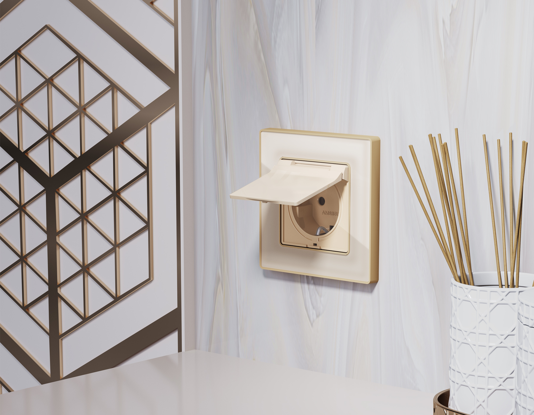 Лицевая панель ALFA (Бежевый глянец) для электрической розетки с заземлением со шторками и крышкой IP44 QUANT
