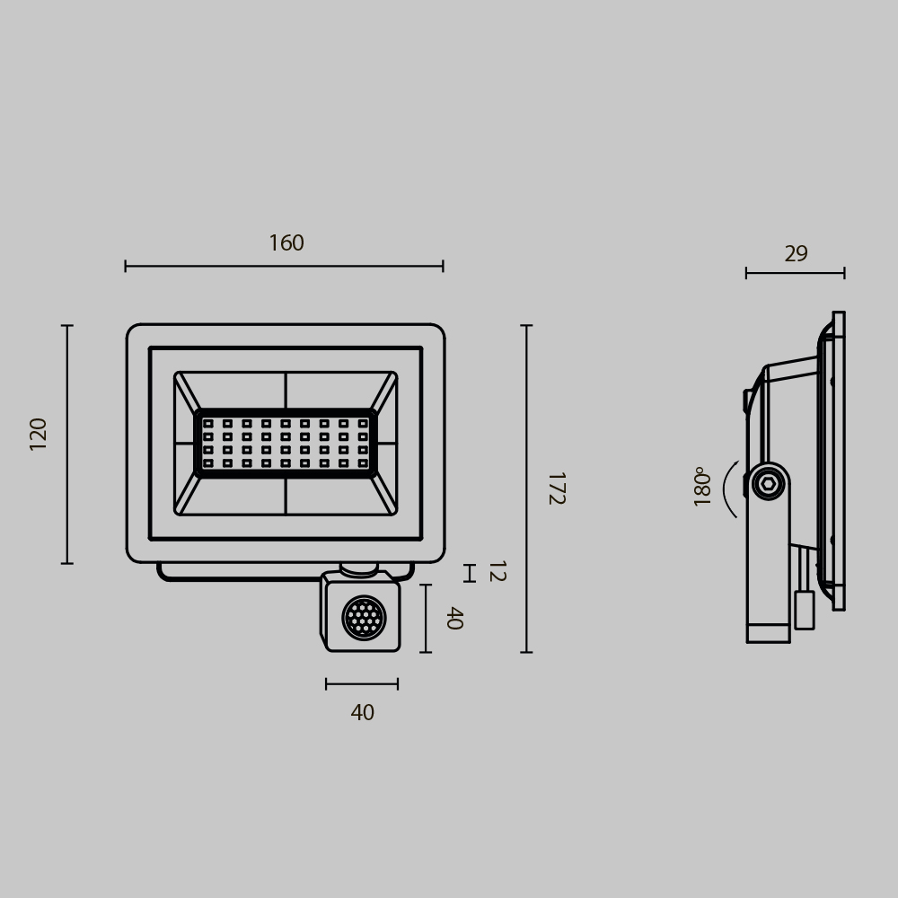 Прожекторы для освещения экстерьеров, рабочих пространств, производственных и промышленных помещений. Материал корпуса — алюминий. Цвет — чёрный. LED-источник света. Два варианта цветовой температуры - 4000К и 6500К. Пять размеров с соответствующими вариантами мощности — 10, 30, 50 Вт с датчиком движения. Модели 100 и 150 Вт без датчиков движения. Высокая степень защиты от пыли и влаги IP65.