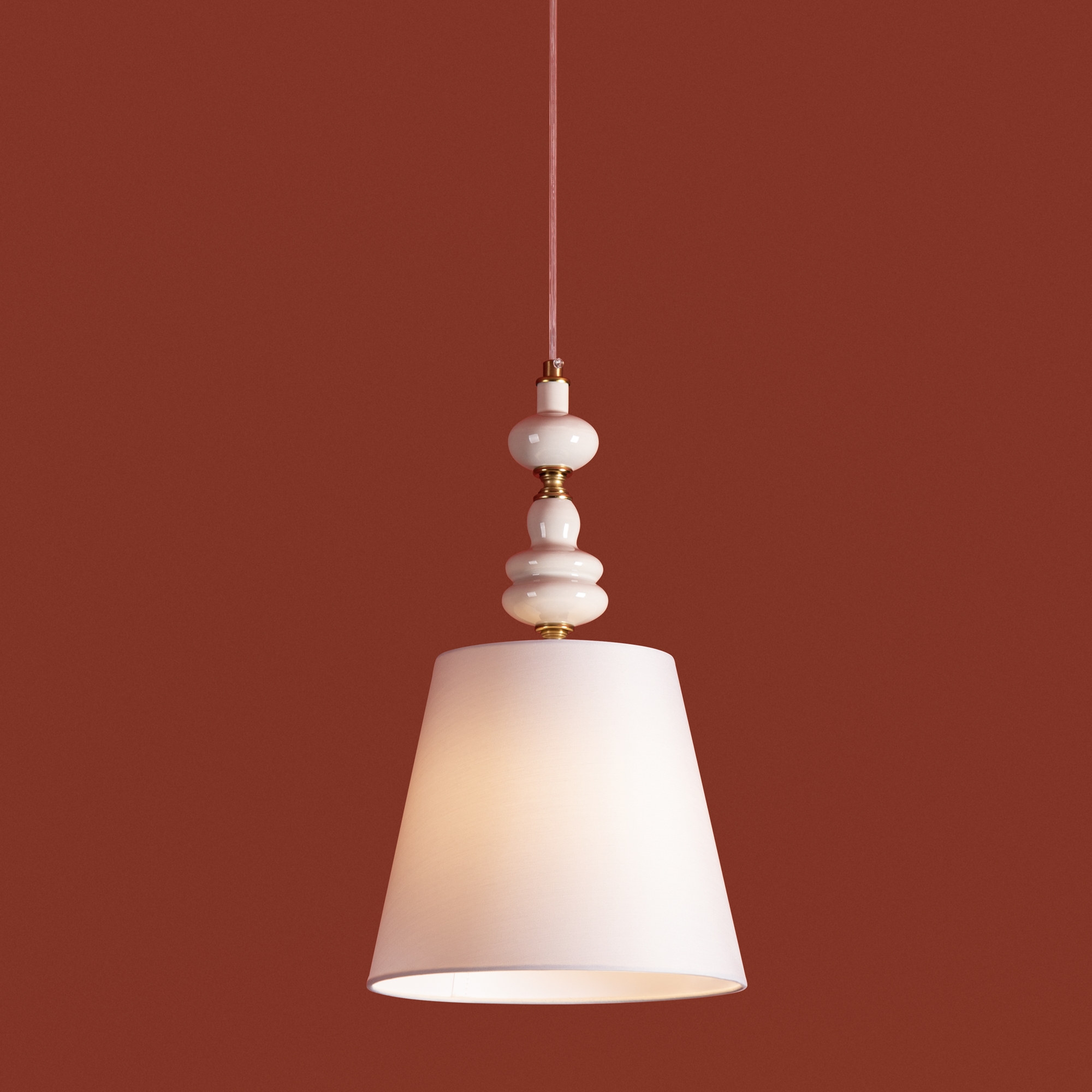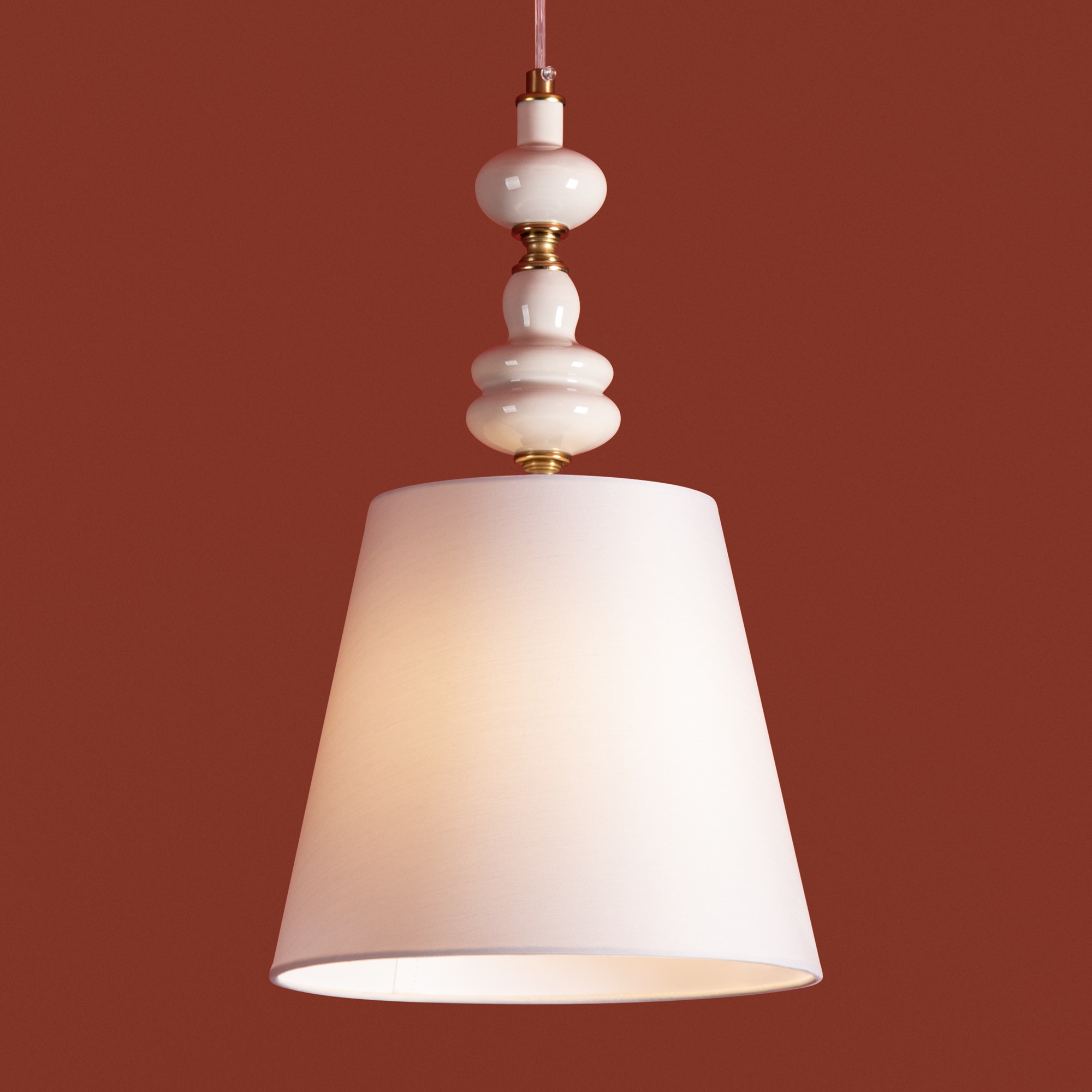 Материал арматуры — металл, цвет — латунь. Подвесные светильники с цоколем E14. Светильники с керамическими декоративными элементами серо бежевых оттенков. Белый абажур, выполнен из натуральной ткани. Сочетание классической элегантности с современным дизайном создает утонченную атмосферу в интерьере.