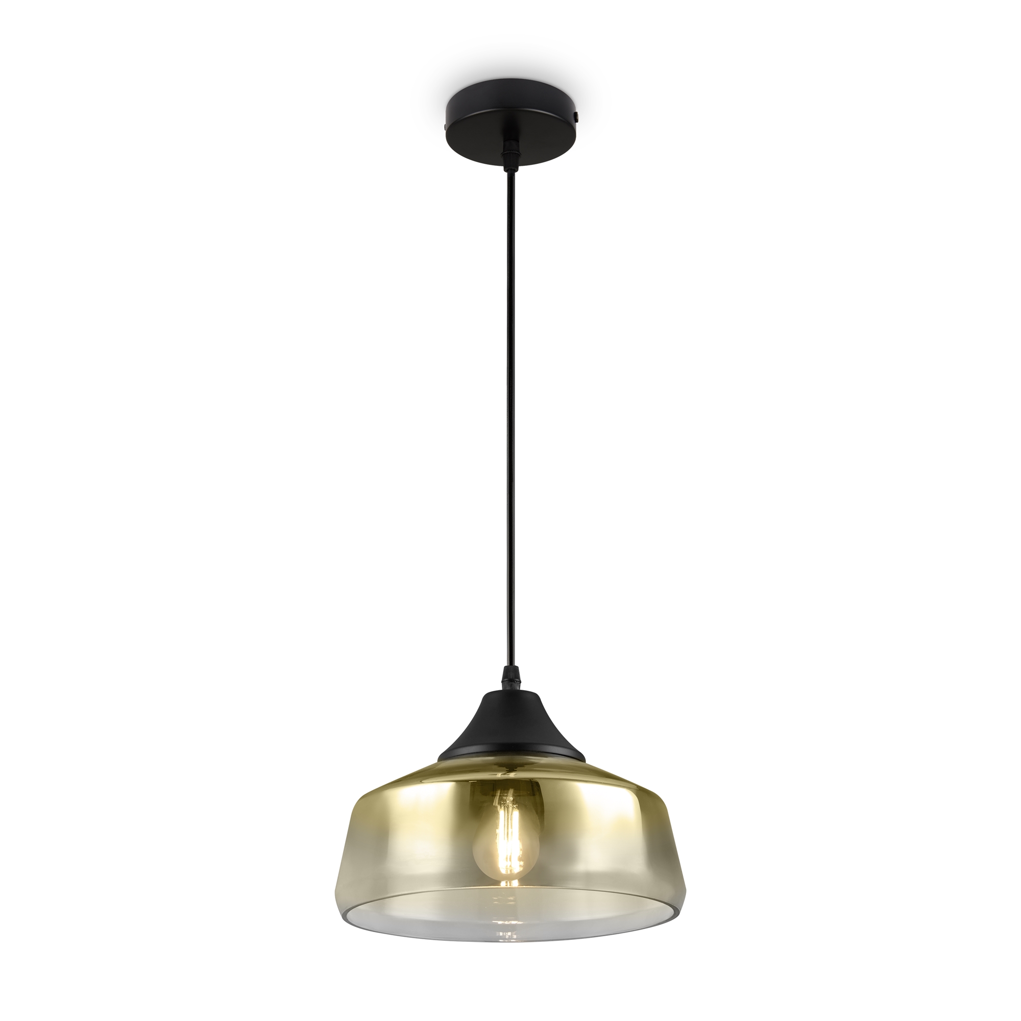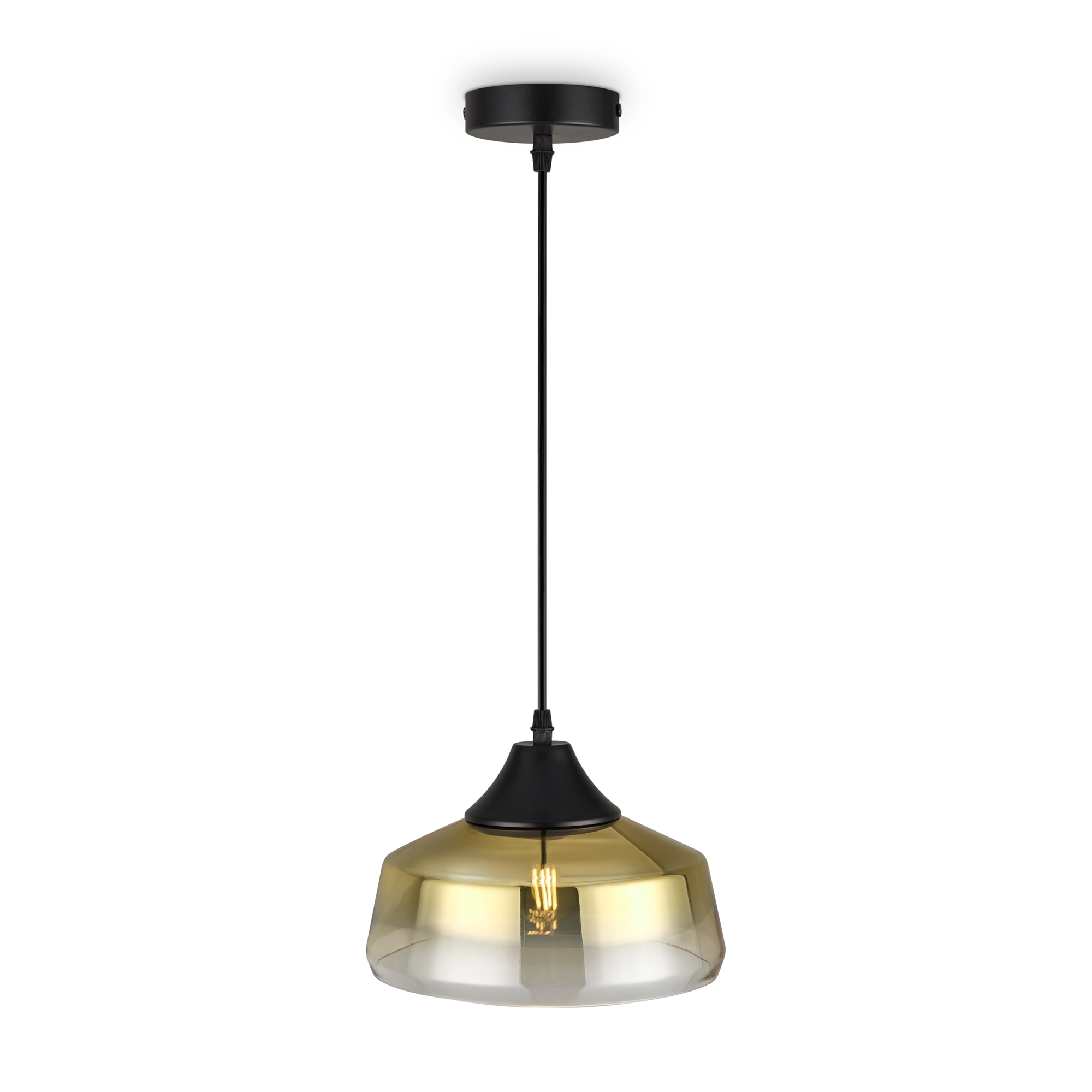 Металлическая арматура в черном цвете. Стеклянный плафон с мягким градиентным переходом оттенков. Цветовые решения – серый, янтарный. Трендовая обтекаемая форма. Источник света – лампа с цоколем E27.