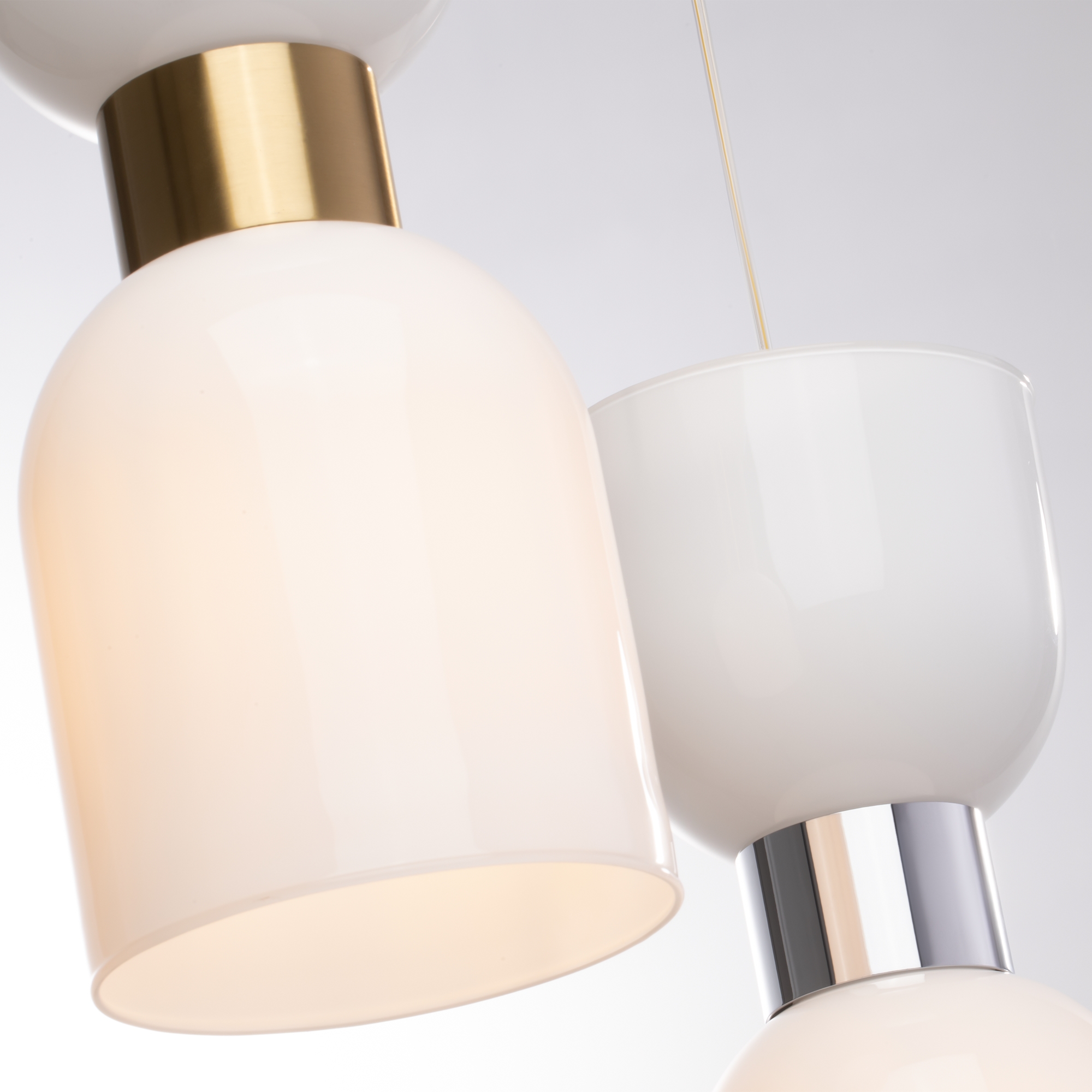 Арматура из металла. Оттенки – хром и латунь. Стеклянные плафоны в двух цветовых решениях: белый глянец и хром с зеркальным эффектом. Оригинальная форма плафонов «песочные часы», двунаправленный световой поток. Широкий ассортимент. Источник света – лампа с цоколем E27.