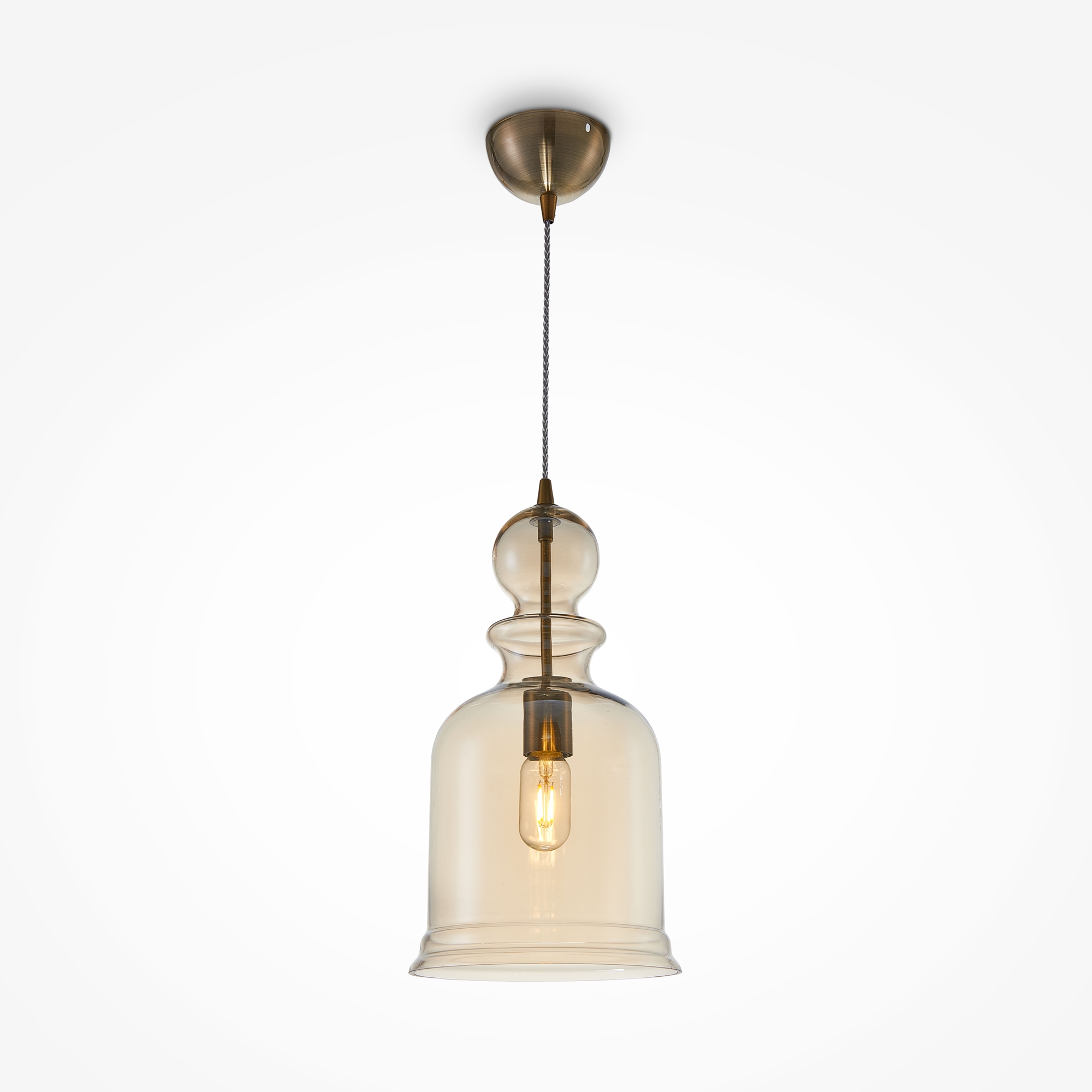 Арматура из металла, оттенок – бронза. Плафон из выдувного стекла в янтарном цвете. Витой провод в текстильной оплетке. Винтажная форма