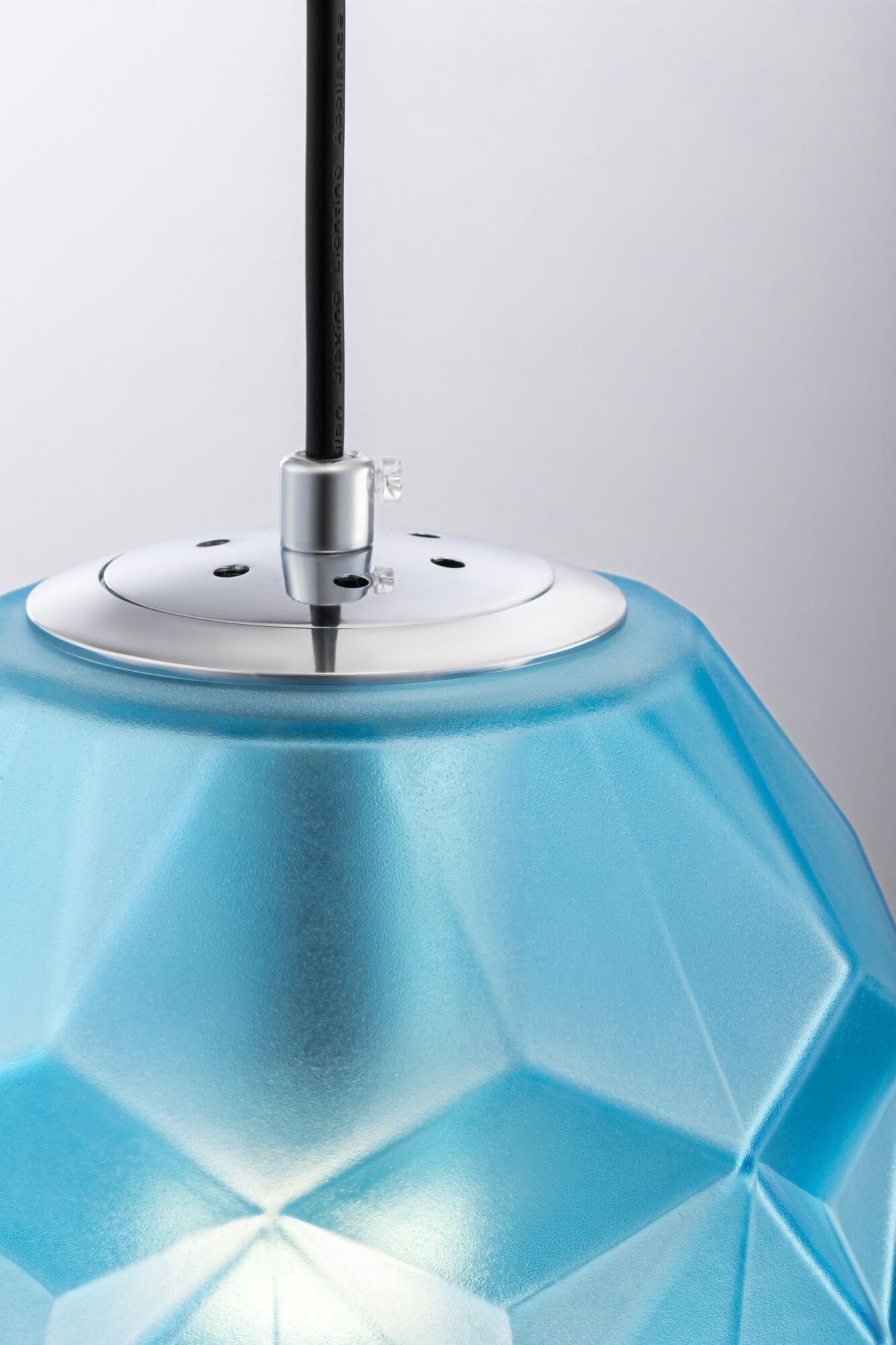 В образе светильников серии Globo сочетаются идеально четкие прямые линии и необычная форма. Многочисленные отражения света зачаровывают зрителя днем и еще больше ночью, при включенном освещении. Плафоны светильников изготовлены из стекла и представлены в голубом, розовом и сером цвете. Арматура сделана из металла. Высота светильников регулируется длиной шнура.