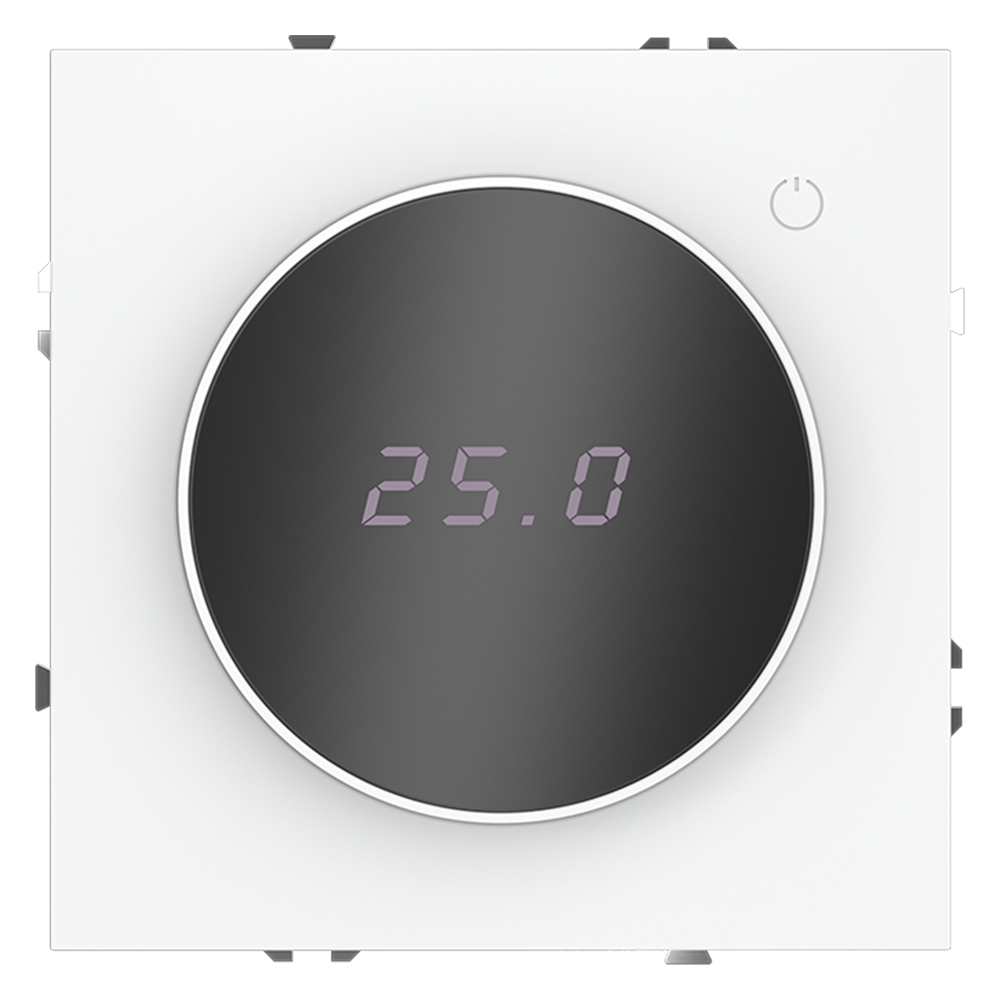 Место установки. Терморегуляторы Voltum предназначены для регулирования температуры электрического теплого пола. Актуальны как в городских квартирах, так и в загородных дачных домах без центрального отопления. Корпус. Дизайн терморегуляторов Voltum сочетается со стилем остальных электрических устройств компании. Они совместимы со всеми рамками S70. Материал внешних декоративных элементов — поликарбонат. Конструктивные особенности. Терморегулятор предназначен для работы с электрическими тёплыми полами различных типов и рассчитан на нагрузку до 3500 Вт. Устройство оснащено дисплеем, на котором отображается температура поверхности пола, обеспечивая удобный контроль системы обогрева. Устройства оснащены светодиодной индикацией режима и дисплеем, на котором отображается температура поверхности пола. Красный индикатор — «подача питания на нагревательный кабель (идет процесс нагрева)», отсутствие индикации — «заданная температура достигнута». В течение 15 минут после нагрева терморегулятор переходит в интеллектуальный «спящий режим», уменьшая яркость подсветки цифр и сокращая энергопотребление. Регулировка осуществляется вращением панели управления. Терморегулятор поставляется в комплекте с механизмом из пластиковой накладки и датчиком температуры.