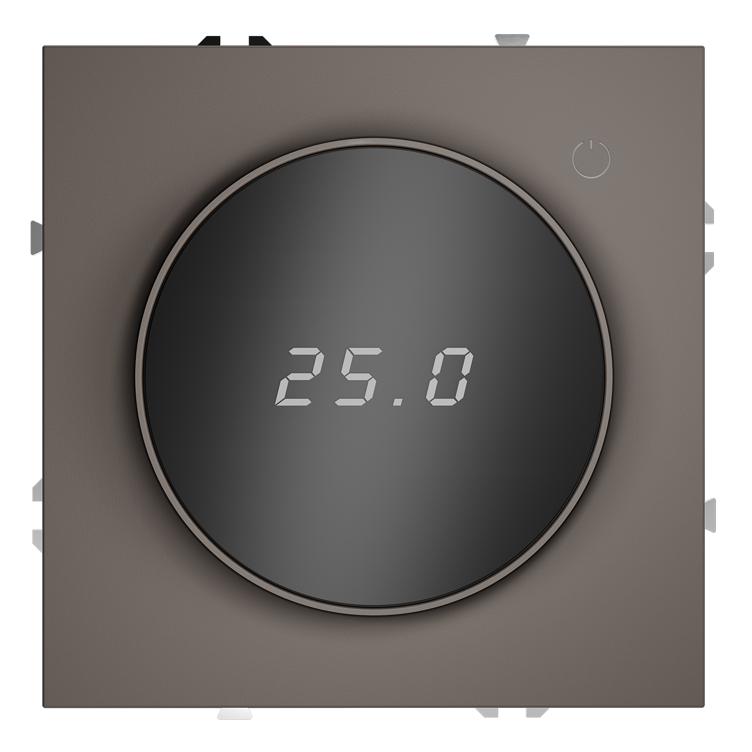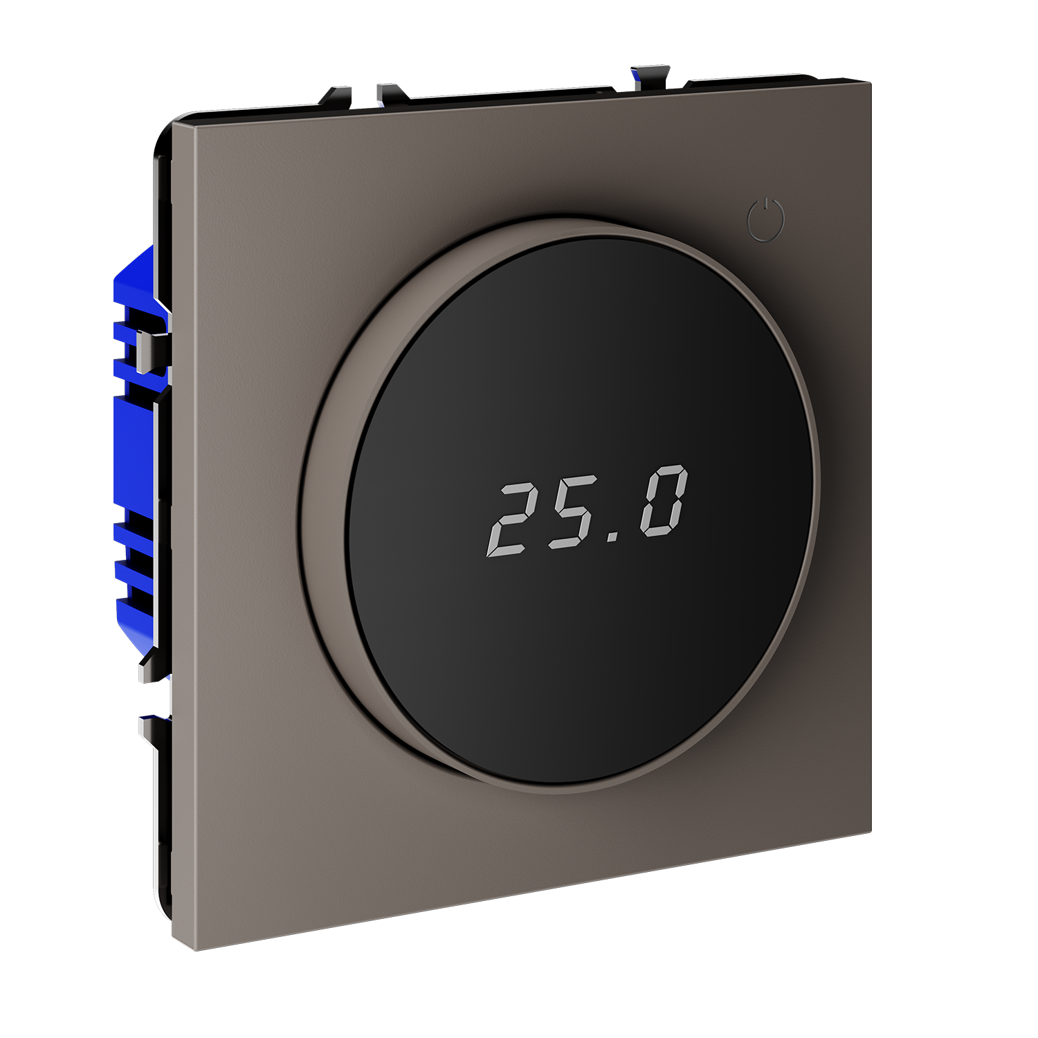 Место установки. Терморегуляторы Voltum предназначены для регулирования температуры электрического теплого пола. Актуальны как в городских квартирах, так и в загородных дачных домах без центрального отопления. Корпус. Дизайн терморегуляторов Voltum сочетается со стилем остальных электрических устройств компании. Они совместимы со всеми рамками S70. Материал внешних декоративных элементов — поликарбонат. Конструктивные особенности. Терморегулятор предназначен для работы с электрическими тёплыми полами различных типов и рассчитан на нагрузку до 3500 Вт. Устройство оснащено дисплеем, на котором отображается температура поверхности пола, обеспечивая удобный контроль системы обогрева. Устройства оснащены светодиодной индикацией режима и дисплеем, на котором отображается температура поверхности пола. Красный индикатор — «подача питания на нагревательный кабель (идет процесс нагрева)», отсутствие индикации — «заданная температура достигнута». В течение 15 минут после нагрева терморегулятор переходит в интеллектуальный «спящий режим», уменьшая яркость подсветки цифр и сокращая энергопотребление. Регулировка осуществляется вращением панели управления. Терморегулятор поставляется в комплекте с механизмом из пластиковой накладки и датчиком температуры.
