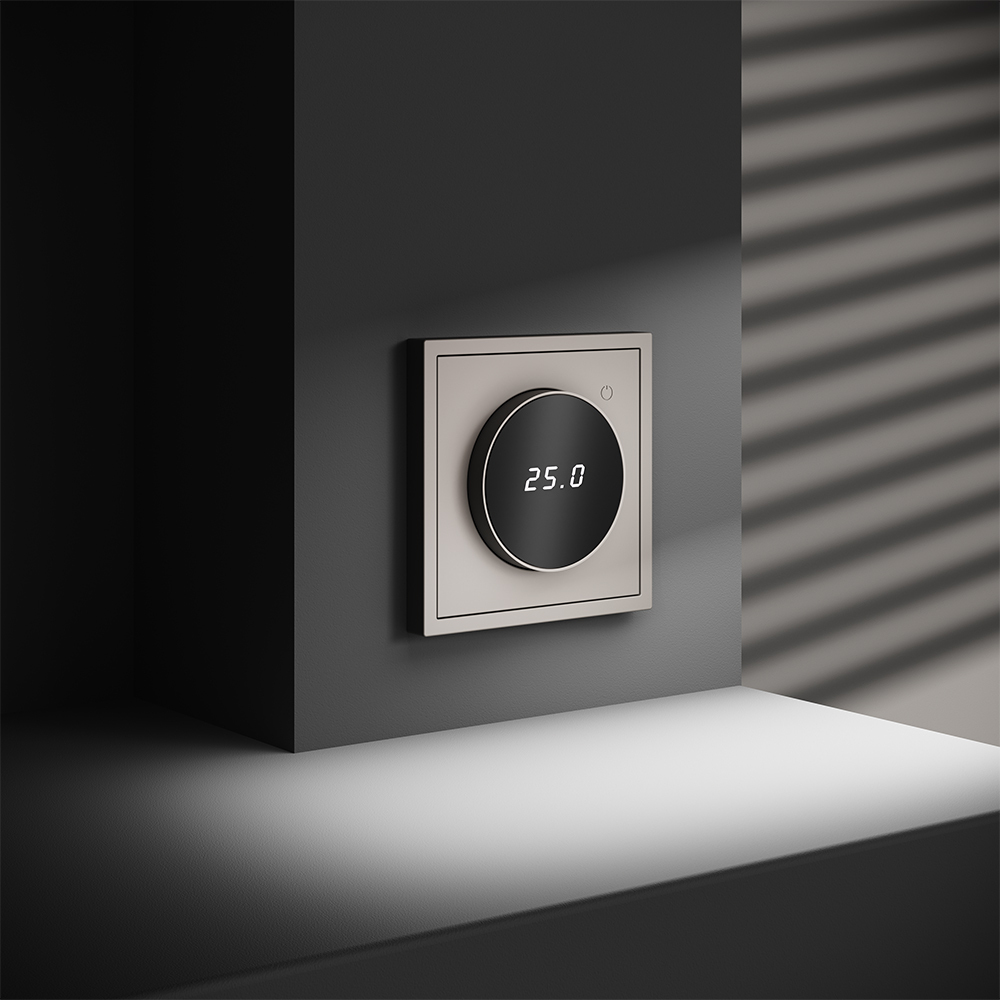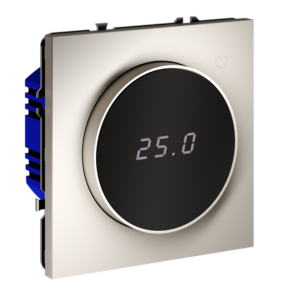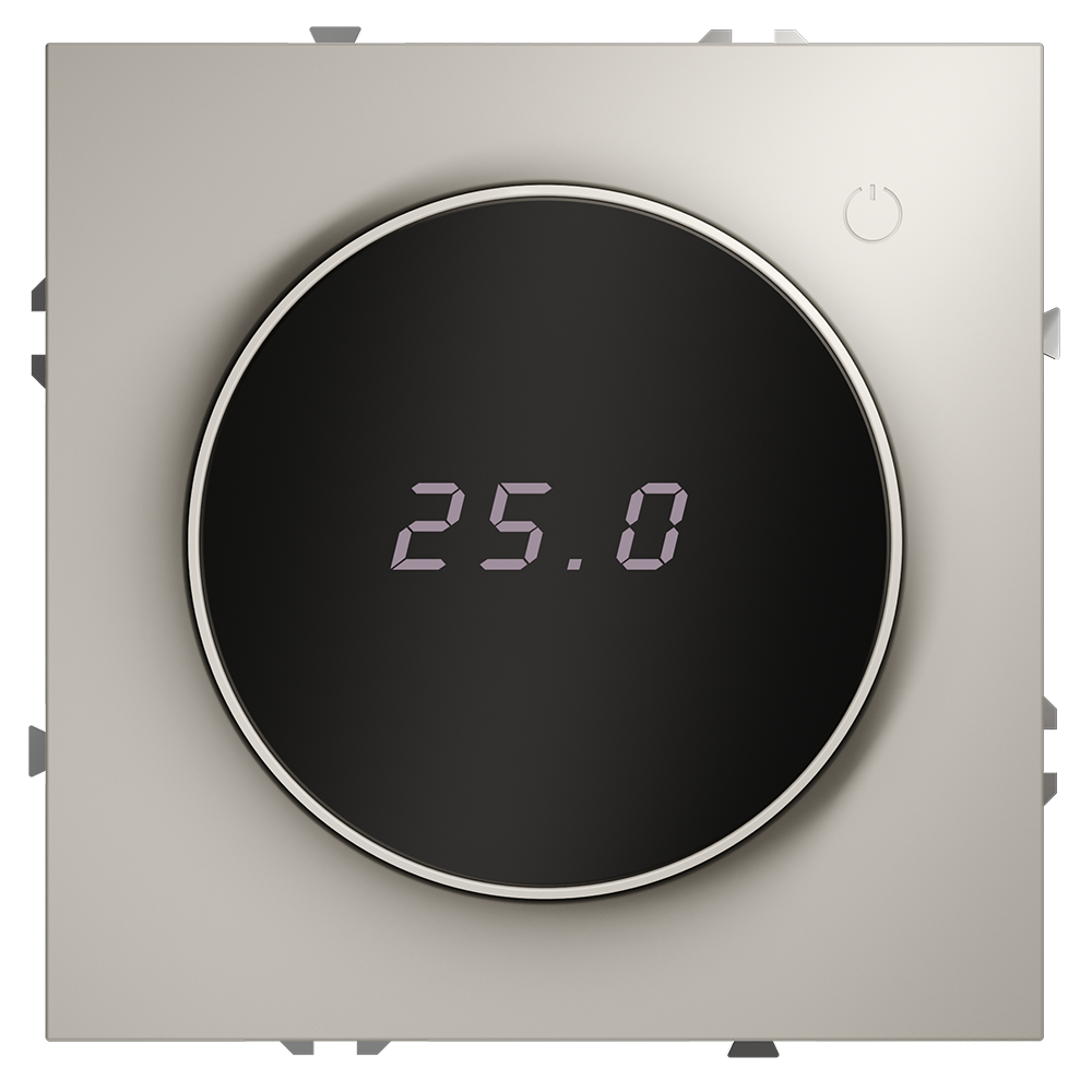 Место установки. Терморегуляторы Voltum предназначены для регулирования температуры электрического теплого пола. Актуальны как в городских квартирах, так и в загородных дачных домах без центрального отопления. Корпус. Дизайн терморегуляторов Voltum сочетается со стилем остальных электрических устройств компании. Они совместимы со всеми рамками S70. Материал внешних декоративных элементов — поликарбонат. Конструктивные особенности. Терморегулятор предназначен для работы с электрическими тёплыми полами различных типов и рассчитан на нагрузку до 3500 Вт. Устройство оснащено дисплеем, на котором отображается температура поверхности пола, обеспечивая удобный контроль системы обогрева. Устройства оснащены светодиодной индикацией режима и дисплеем, на котором отображается температура поверхности пола. Красный индикатор — «подача питания на нагревательный кабель (идет процесс нагрева)», отсутствие индикации — «заданная температура достигнута». В течение 15 минут после нагрева терморегулятор переходит в интеллектуальный «спящий режим», уменьшая яркость подсветки цифр и сокращая энергопотребление. Регулировка осуществляется вращением панели управления. Терморегулятор поставляется в комплекте с механизмом из пластиковой накладки и датчиком температуры.