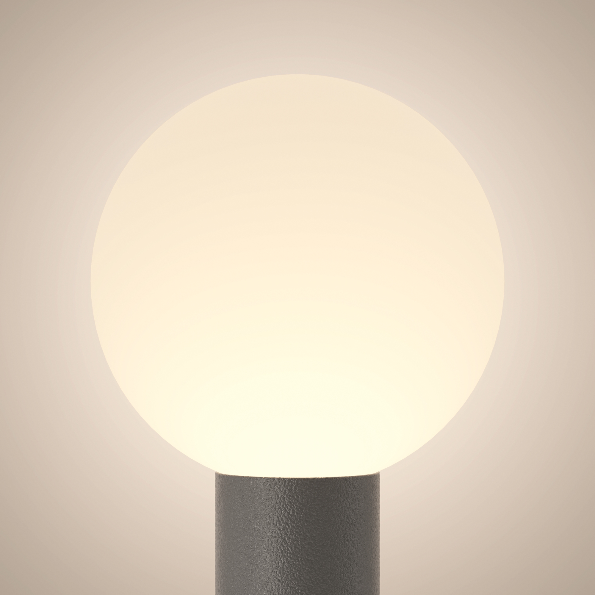 Алюминиевый корпус. Оттенки - черный, серый. Сферические плафоны из белого матового стекла. Защита от коррозии и перападов температур. Высокая степень защиты — IP 54. Источник света — лампа с цоколем E27.