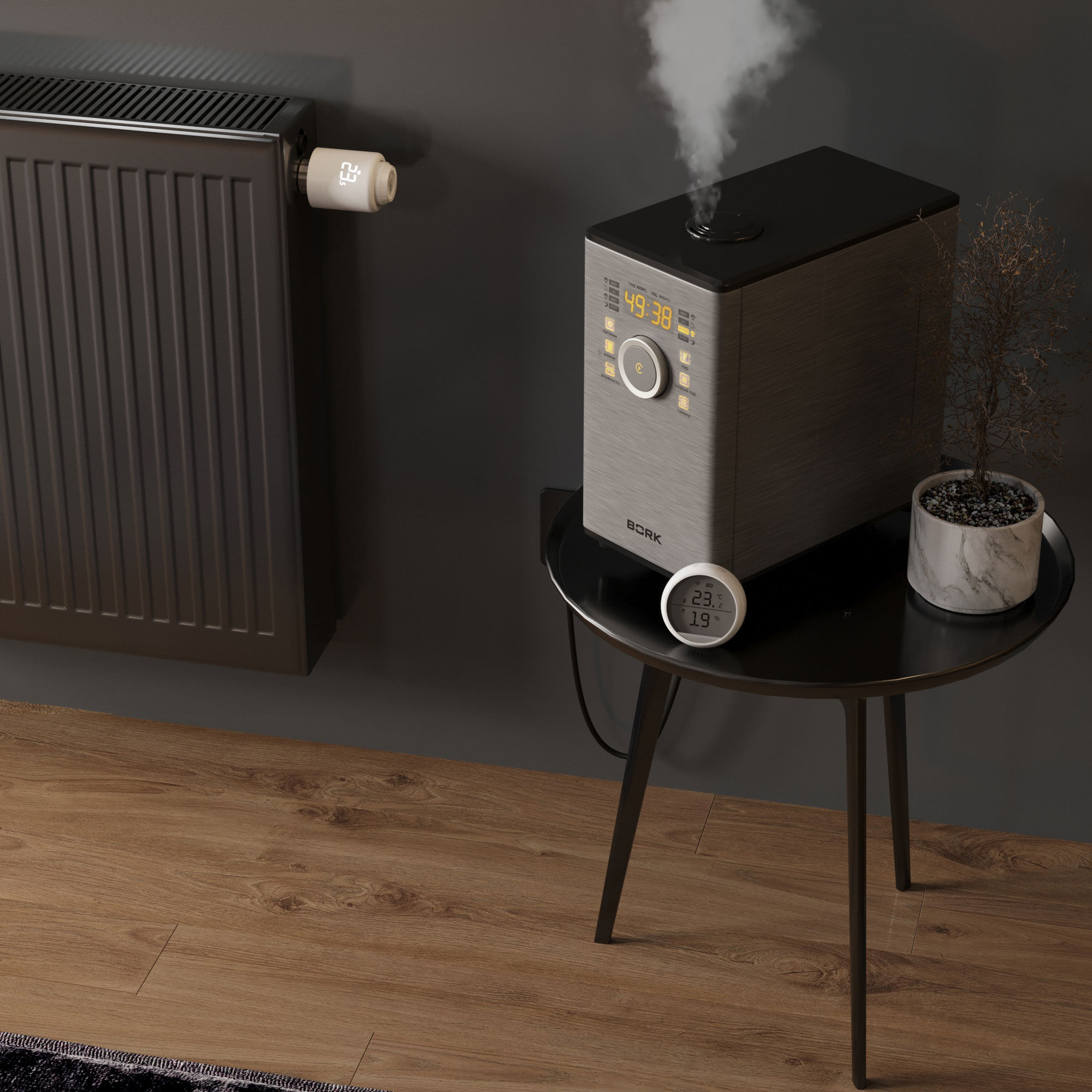 С умным терморегулятором легко настраивать температуру радиатора и водяного теплого пола на любом расстоянии. Управление осуществляется при помощи смартфона или планшета, подключенного к сети интернет. Кроме дистанционного контроля настройки также доступны в ручном режиме.