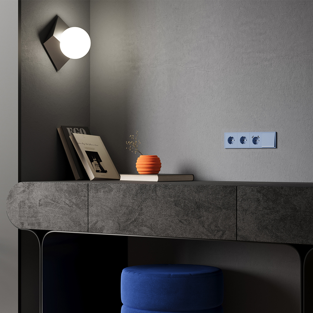 Модульная система серии S70 с раздельной поставкой механизмов, накладок и рамок позволяет монтировать электротехническую основу во время черновых работ, а выбор стилевого решения отложить до завершения дизайн-проекта. При смене интерьера вы легко обновите внешний вид, заменив только лицевые панели без вмешательства в проводку. Лёгкость и яркость оттенка Деним" прекрасно комбинируется с голубо-бирюзовой палитрой. Он станет удачным выбором для детских пространств и интерьеров кафе, добавляя им живости и современности."